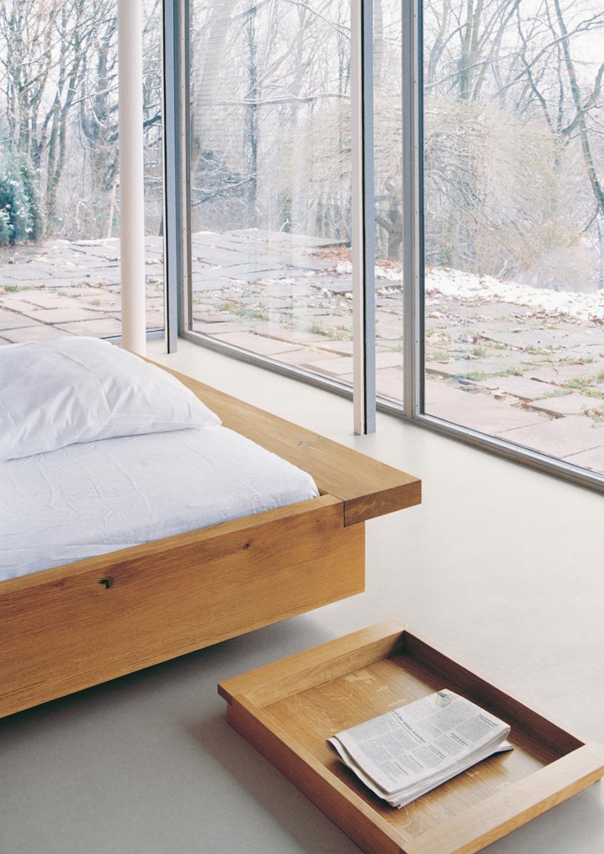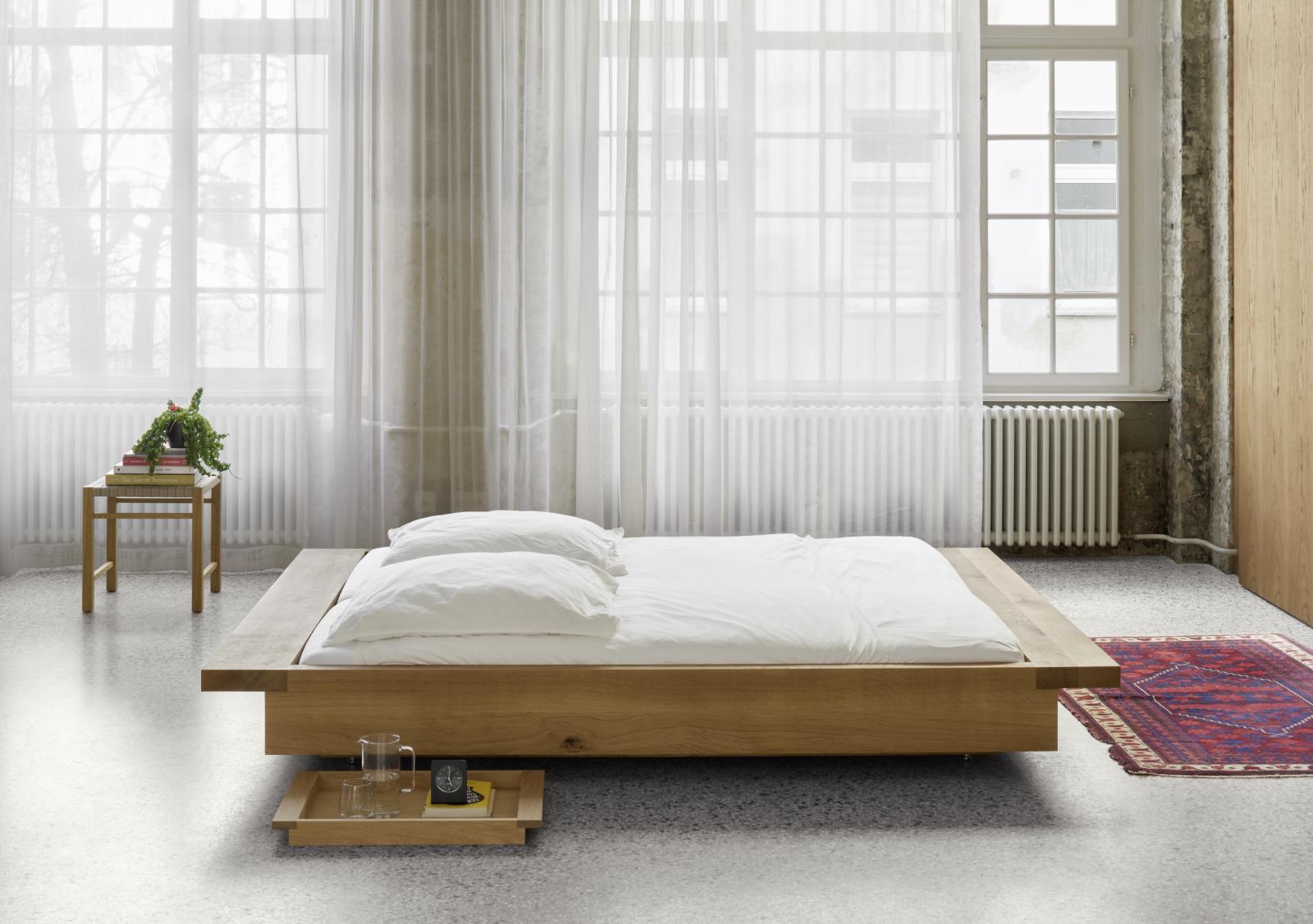 The bed NOAH with its architectural form is especially compelling due to the extended frame on both sides that can also act as a shelf. The floating character of NOAH bed stands in an interesting contrast to the solid wood material.