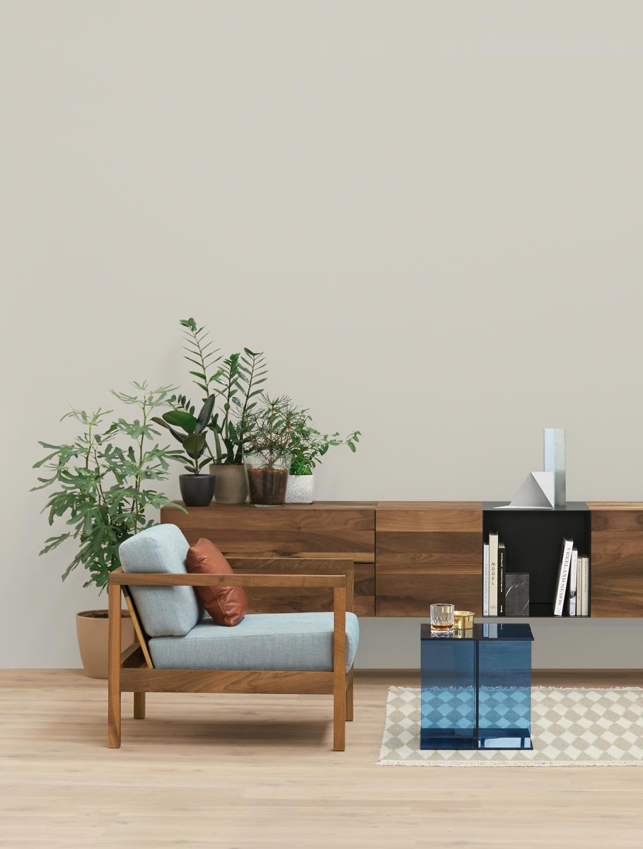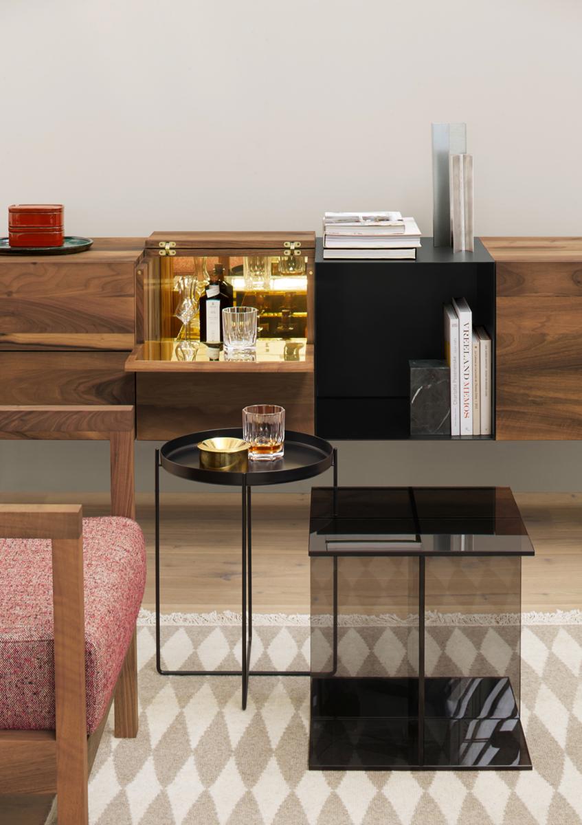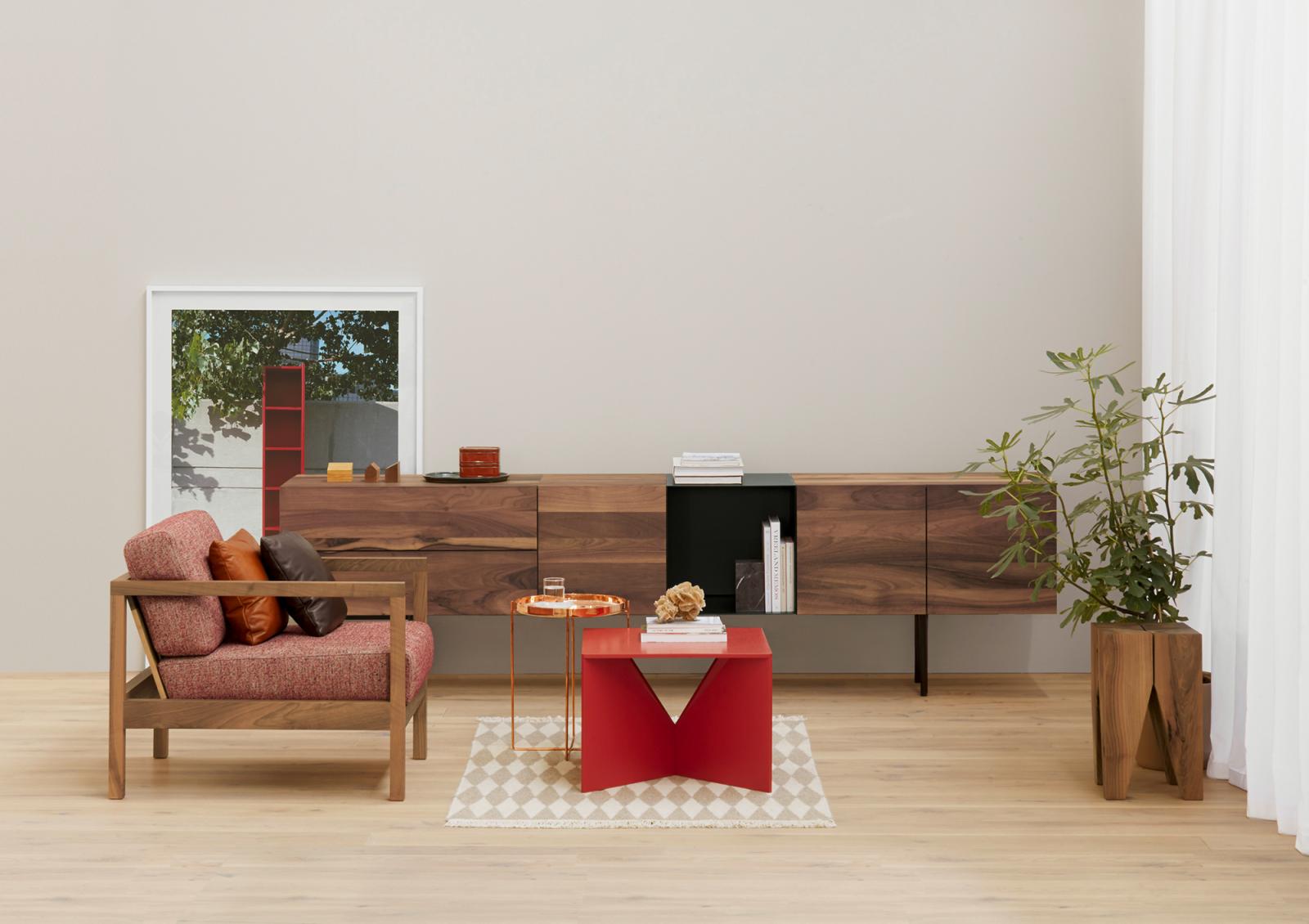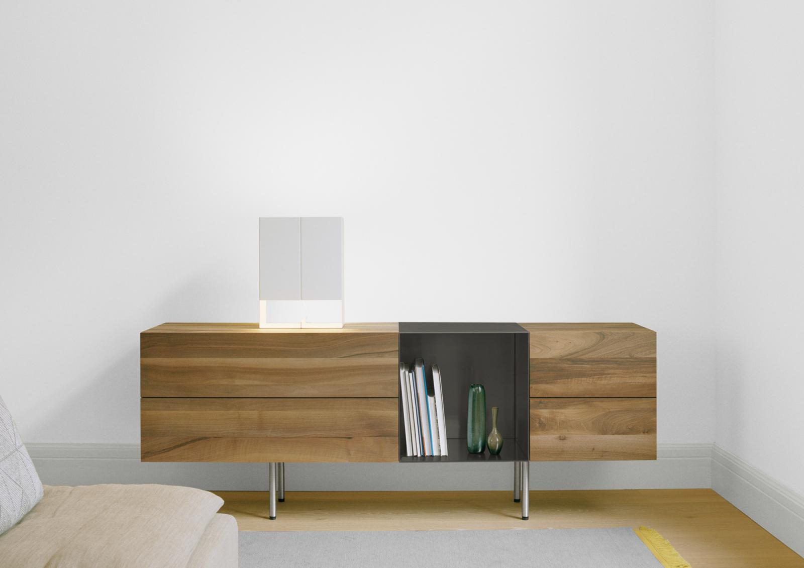 DARA is an open shelf produced in contrasting powder-coated aluminium, complementing the solid wood sideboard series SHAHNAZ and MAHNAZ. Offered in signal white, umbra grey and jet black, DARA is an enriching and functional element for the sideboard series allowing objects and books to be displayed openly within the sideboard.