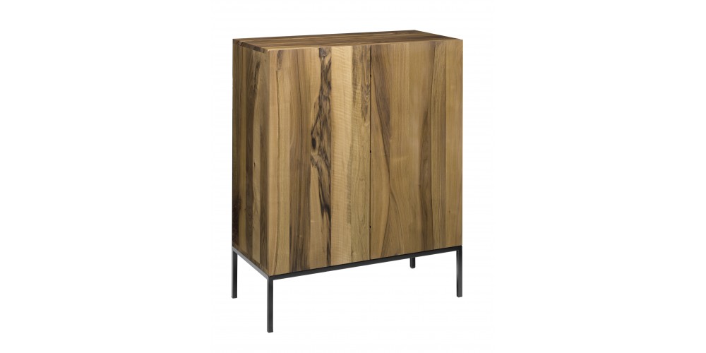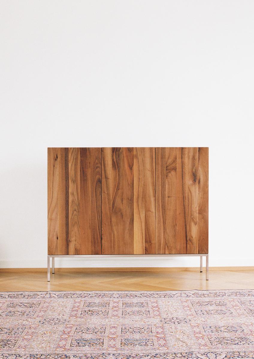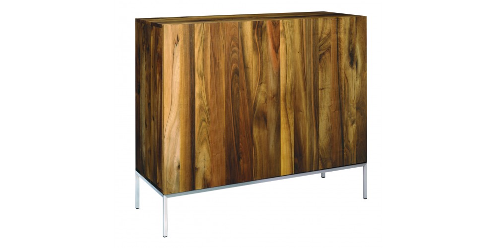 The sideboard FARIBA is particularly striking with its vertical display of solid wood grain. FARIBA elegantly highlights the combination of solid wood and a seamless stainless steel frame. The sides of the drawers have an end-to-end bevel functioning as handle. FARIBA is also available in a two door version and with a powder-coated steel frame.
