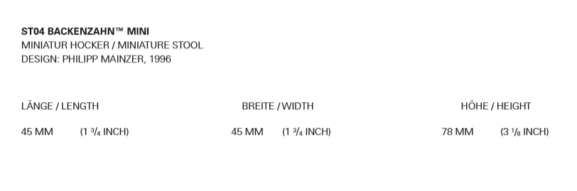 The modern design classic BACKENZAHN? is an identifiable icon for e15. Featuring the signature form of the stool, BACKENZAHN? MINI represents an accurate miniature on a scale of 1:6, featuring the characteristic concave seat of the original stool.
