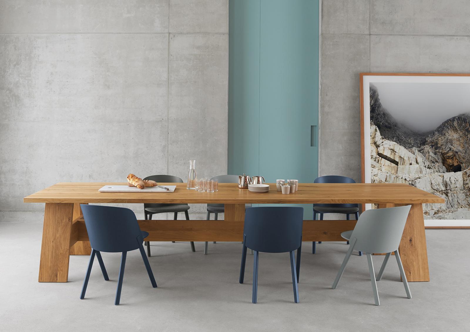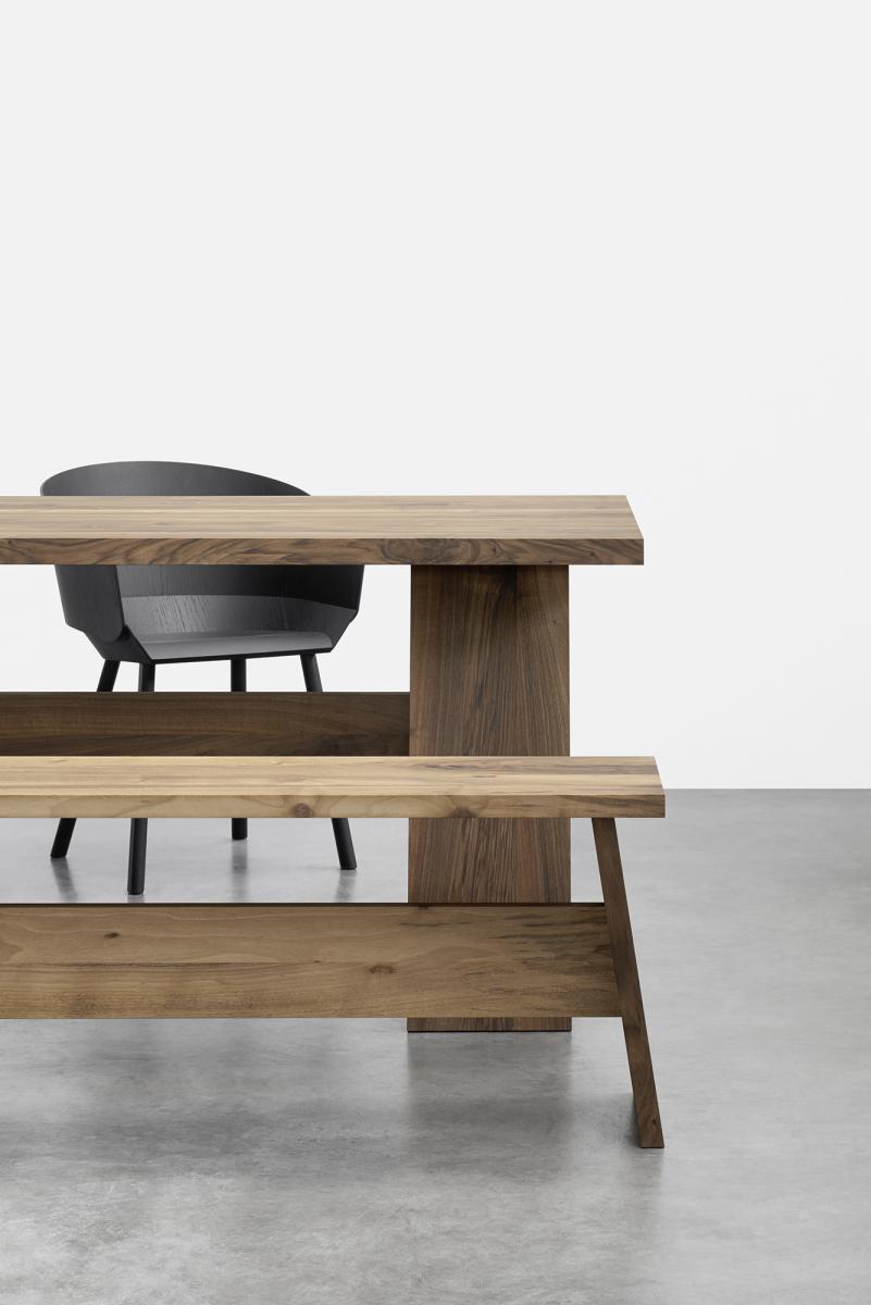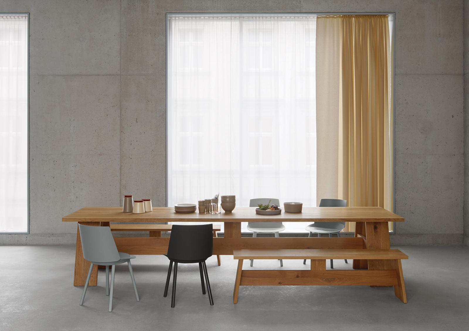 Originally conceived for an architectural project in the English countryside, table FAYLAND features the pure use of material and a clear design language, which are shared aesthetics of e15 and David Chipperfield. Made of solid wood, the constructive details are at the core of its refined and elegant design: a horizontal bar with centred support provides stability while the table ends overlap the frame, providing additional seating space. In addition to European walnut and solid oak in oiled or white pigmented surfaces.