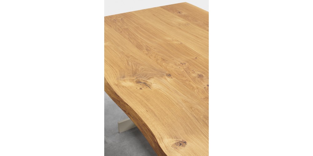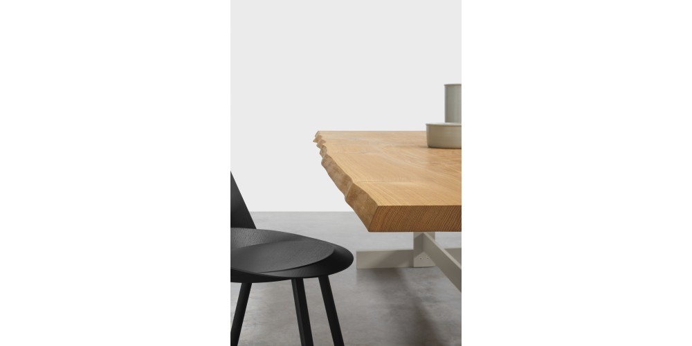 Inspired by Suprematist compositions, table KAZIMIR by Philipp Mainzer features a bold mix of geometric forms and materials. Focussing on a distinct construction, the tabletop made from solid European oak or walnut rests on a metal centre base, allowing for various interpretations in private and public spaces. Available in a range of standard and custom colours as well as exclusive materials such as galvanised zinc, blackened steel and brushed brass, the frame features a characteristic refectory table construction, which provides stability for tables up to 3600 MM (141 34 INCH) and generous seating at the table ends. KAZIMIR RAW features solid wood boards with a width of up to 250 MM (9 78 INCH) exposing the brushed natural edges of the tree.