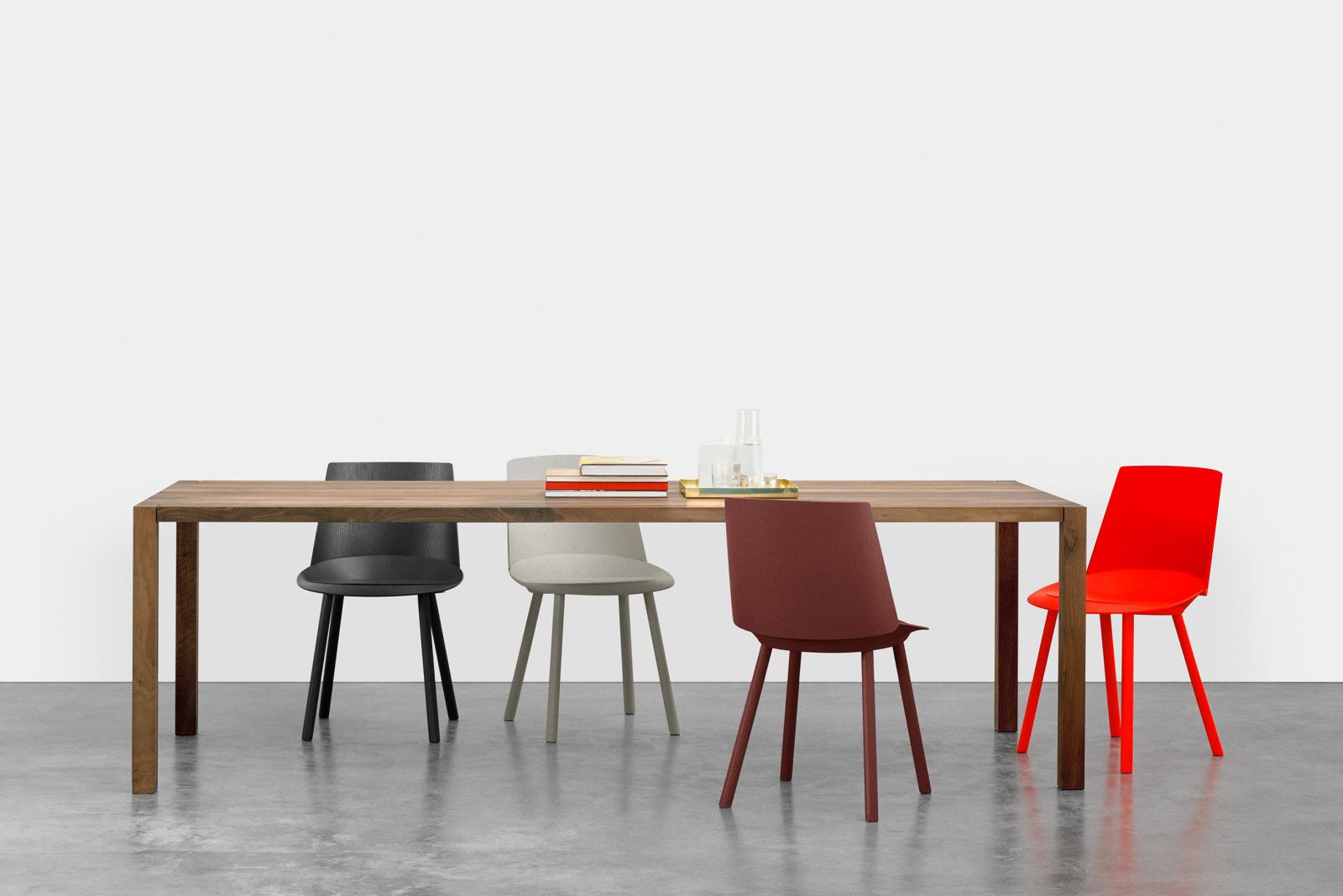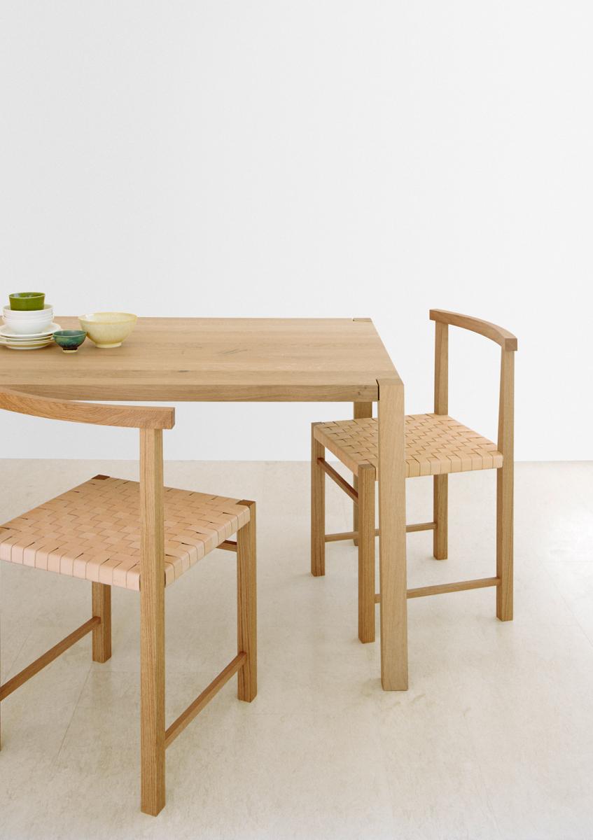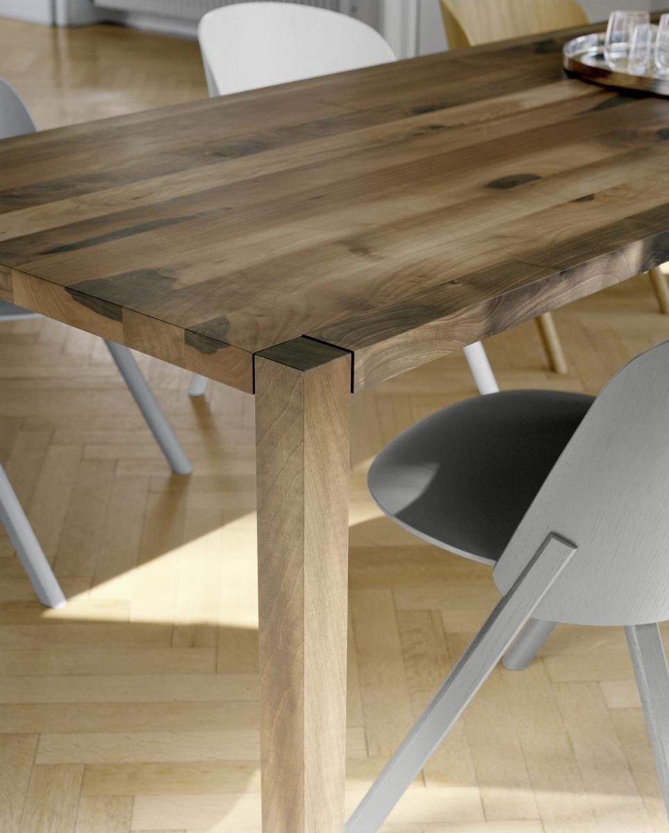 The table SLOANE is a lean and elegant solid wood dining table. Characteristic of iconic e15 solid wood tables, the square legs of SLOANE intersect with the slim 40 MM (1 5/8 INCH) tabletop with the supporting structure incorporated into the tabletop. Its slim silhouette is further emphasised with a new wood finish that is offered for SLOANE, white pigmented waxed, which exudes lightness and elegance. Available from a length of L 1400 MM (55 1/8 INCH), SLOANE is a dining table ideal also for smaller spaces. The clearance underneath the table top measures 710 MM (28 INCH). The table can be disassembled into five parts.