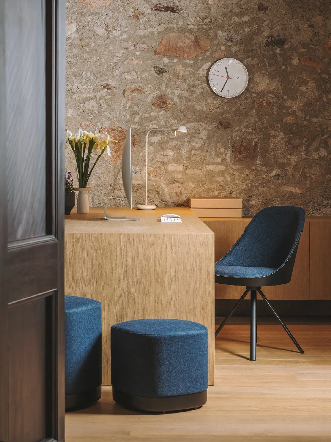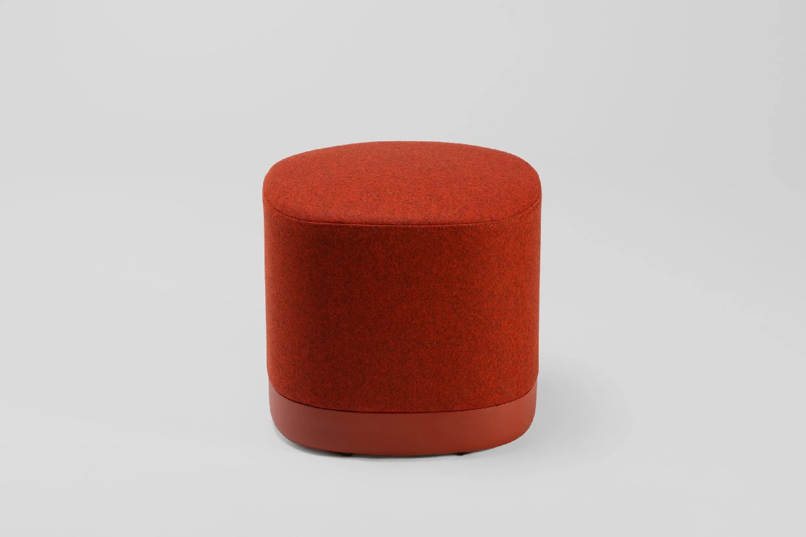 The low Puck pouf has an aluminium base lacquered in any of our colours and with or without castors. The seat can be upholstered in one or two fabrics, and that is why it is possible to combine one, two or three tones in the same pouf.