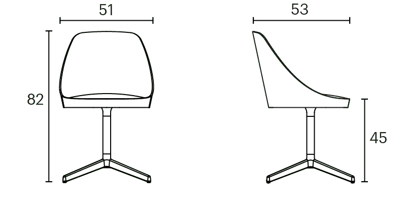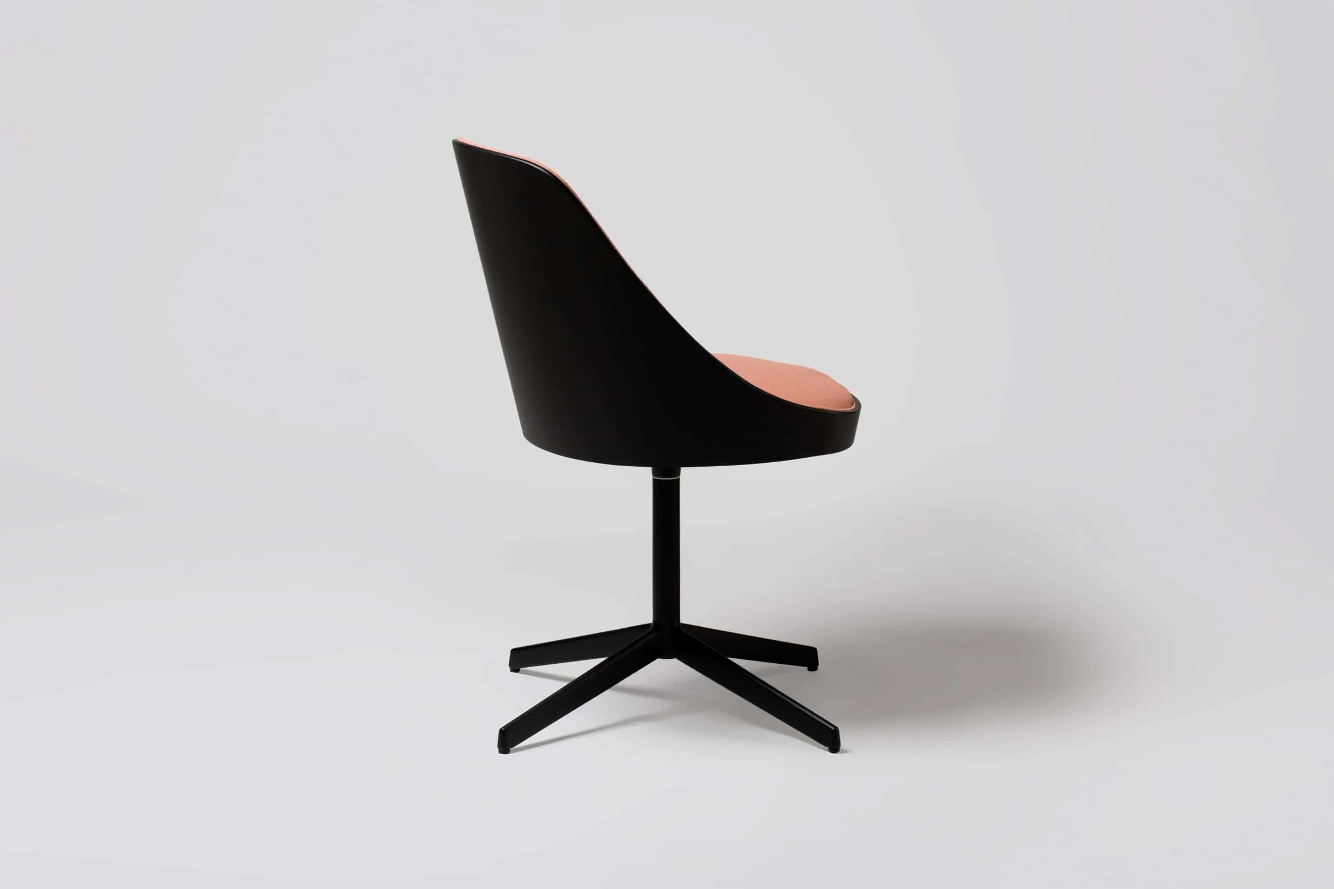 The shell of Kaiak confident chair, available with or without arms, is made of natural or stained oak wood and it has a broad range of upholstery options available: fully upholstered, upholstered seat, three quarters upholstered and inside upholstery. Its 4-star swivel structure can be lacquered in any of our colours.