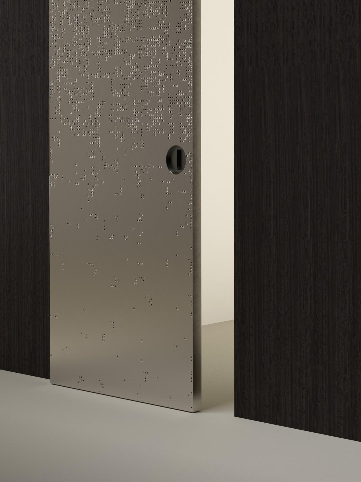 The Liquid Metal, applied on the iconic Unlimited texture, enhances the visible and tactile textures of the carving, releasing heat and energy and animating the surface of the panels with luminous and three-dimensional effects.