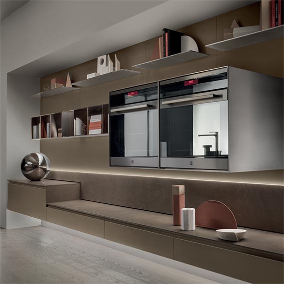 滑動島臺采用多節的橡木飾面,鋁漆結構呈現棕色金屬效果。