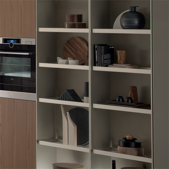 焦糖榆木色高柜和擱板,透明灰色玻璃,框架呈現(xiàn)鈀金屬噴漆效果。