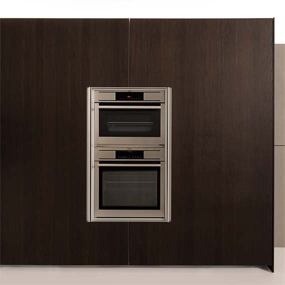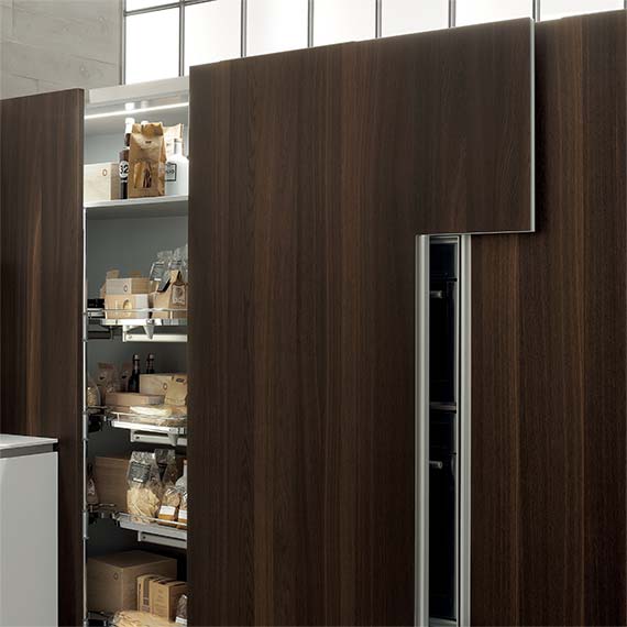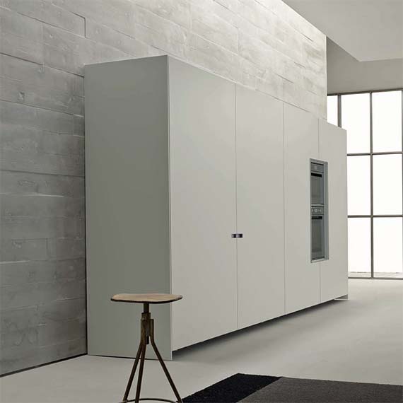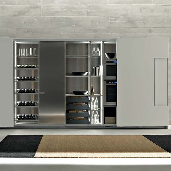 柜門采用受電弓設(shè)計的櫥柜系統(tǒng),能與廚房的模塊化方案完美融合。既可以在特定部分中放置可見的電器,也可以借助“Ernestomeda 安全烤箱關(guān)閉”選配安全系統(tǒng)隱藏電器。