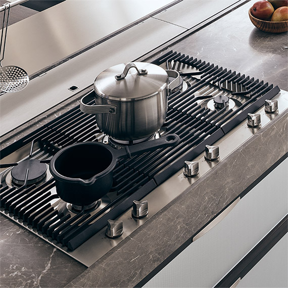 可以選擇內置型或焊接型,帶有一體式開關或設于操作臺前緣處的開關,由 Ernestomeda 開發。幾何鑄鐵柵格如同專業炊具般堅固耐用,兼具時尚感與便捷性。它們可以確保各種尺寸的炊具在爐子上保持極其穩定的狀態,堪稱實用與優雅完美結合的理想產品。