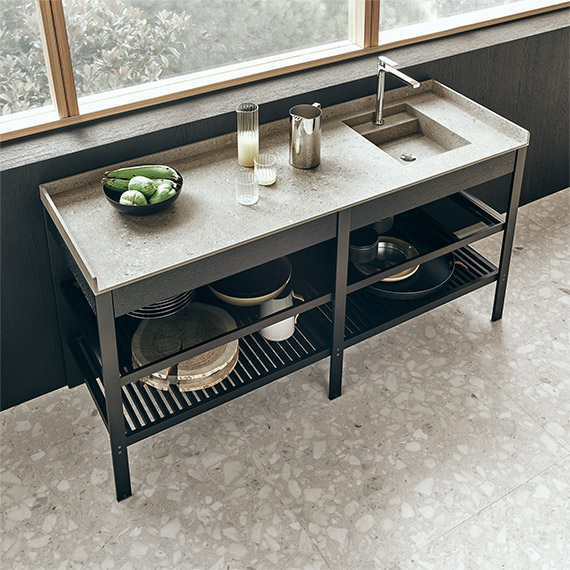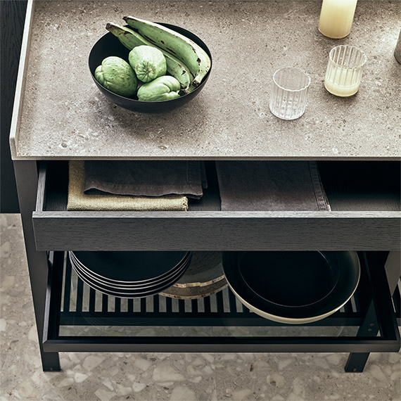 獨(dú)立式清洗整柜帶有拉出式擱板,在這里采用縞瑪瑙 metallix 鋁材和透明灰玻璃制作。固定擱板和拉出式抽屜采用開孔型黑橡木制作。操作臺(tái)采用 Cervino 柏油石材+ 制作。背面板采用開孔型黑橡木制作。