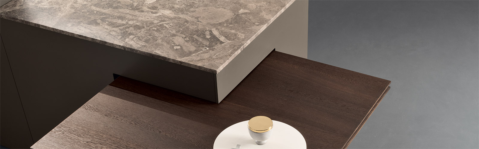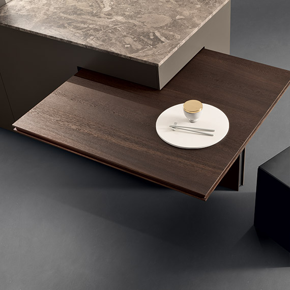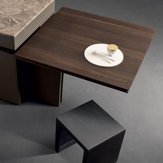 多節 Terra d'Ombra 橡木材質的旋轉桌。臺面選材為經熱處理的橡木,框架采用 Mocha Flat Matt 噴漆處理。