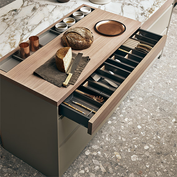 可以選擇三種 K-lab 橡木或高級木材(復古橡木和櫟木),設有可容納鋼制餐具托盤的凹槽。