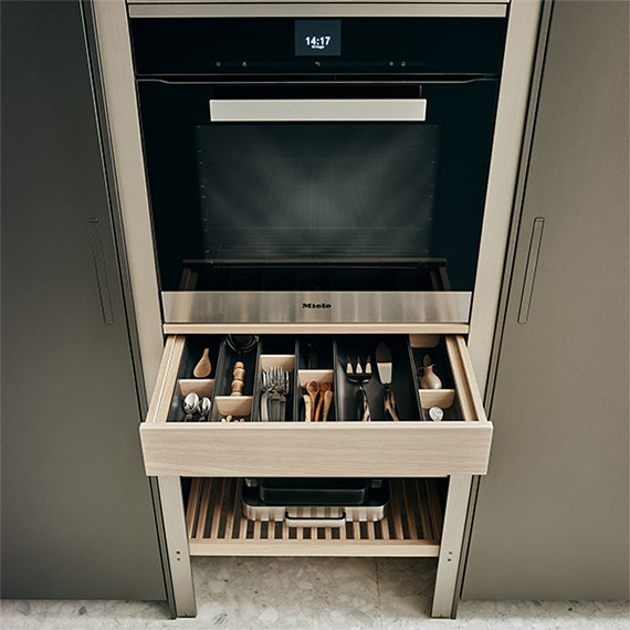 塊化內部配件,適用于采用 Legrabox 側面的抽屜。由于種類繁多的定制配件可以滿足最廣泛多樣的需求(刀具、香料、小容器、罐子和廚用薄膜支架)并發揮不同尺寸的可拆卸隔板的潛力,通過對各個細節的精心設計,可以根據個人品味定制模塊化抽屜內部空間。Peltrox 陽極氧化鋁框架配有北歐橡木隔板。