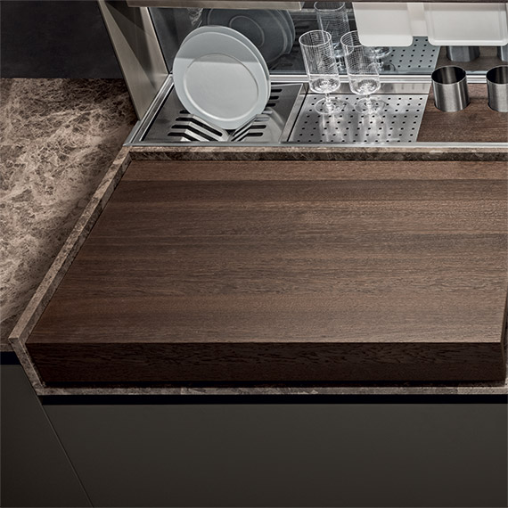 經熱處理的案板可沿導軌滑動。可用于制備食物和作為工作臺面,也可用作爐盤蓋。
