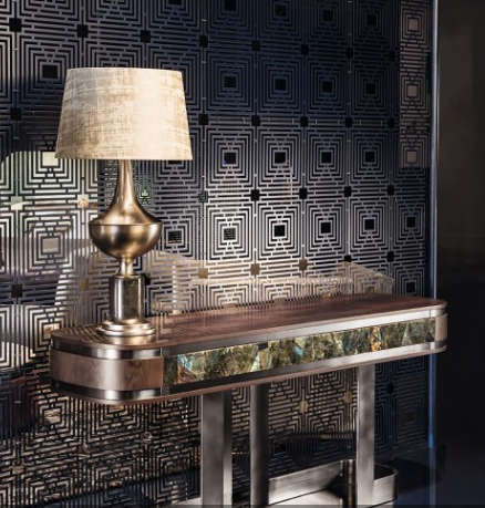 Consolle coordinata – a completamento del dining room – con il tavolo Paul e le sedie Gatsby. Elegante cura del dettaglio. cassetti con frontale personalizzabile con pietre preziose o legno.
