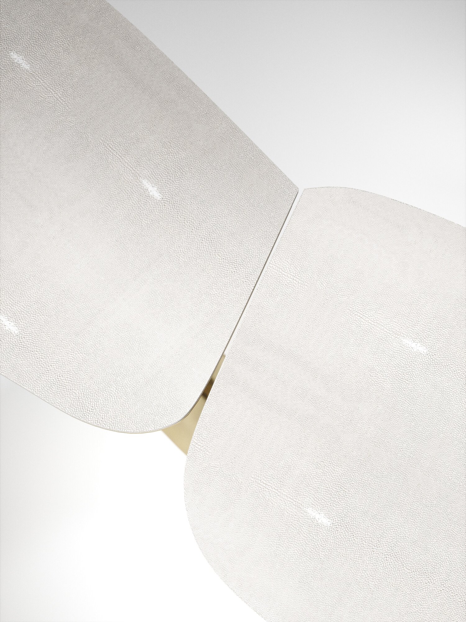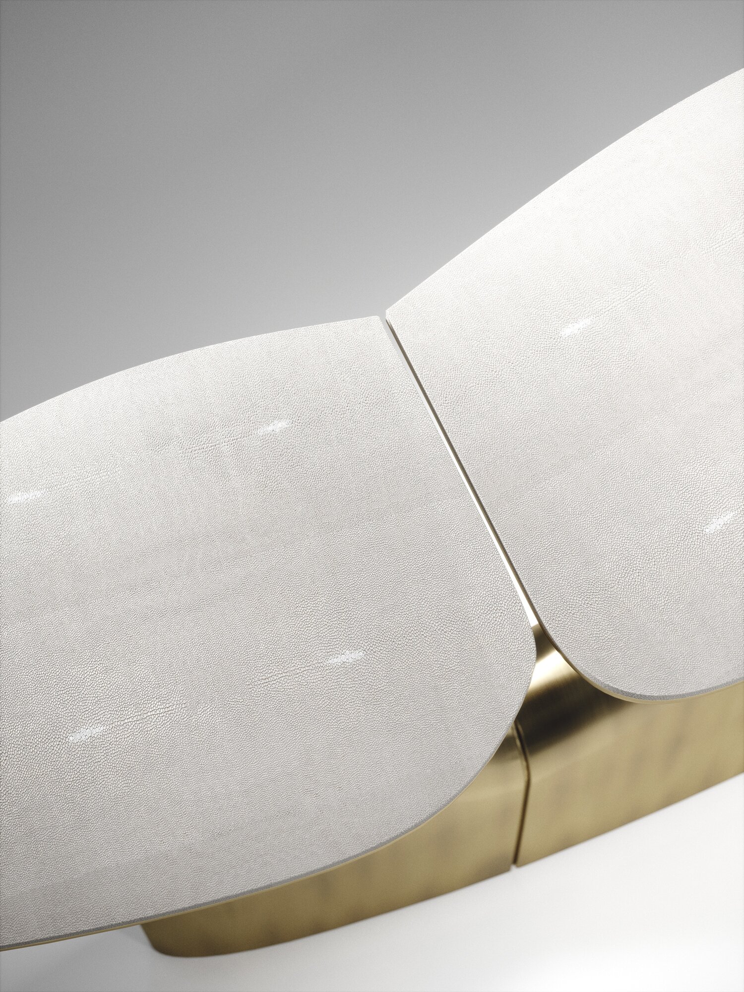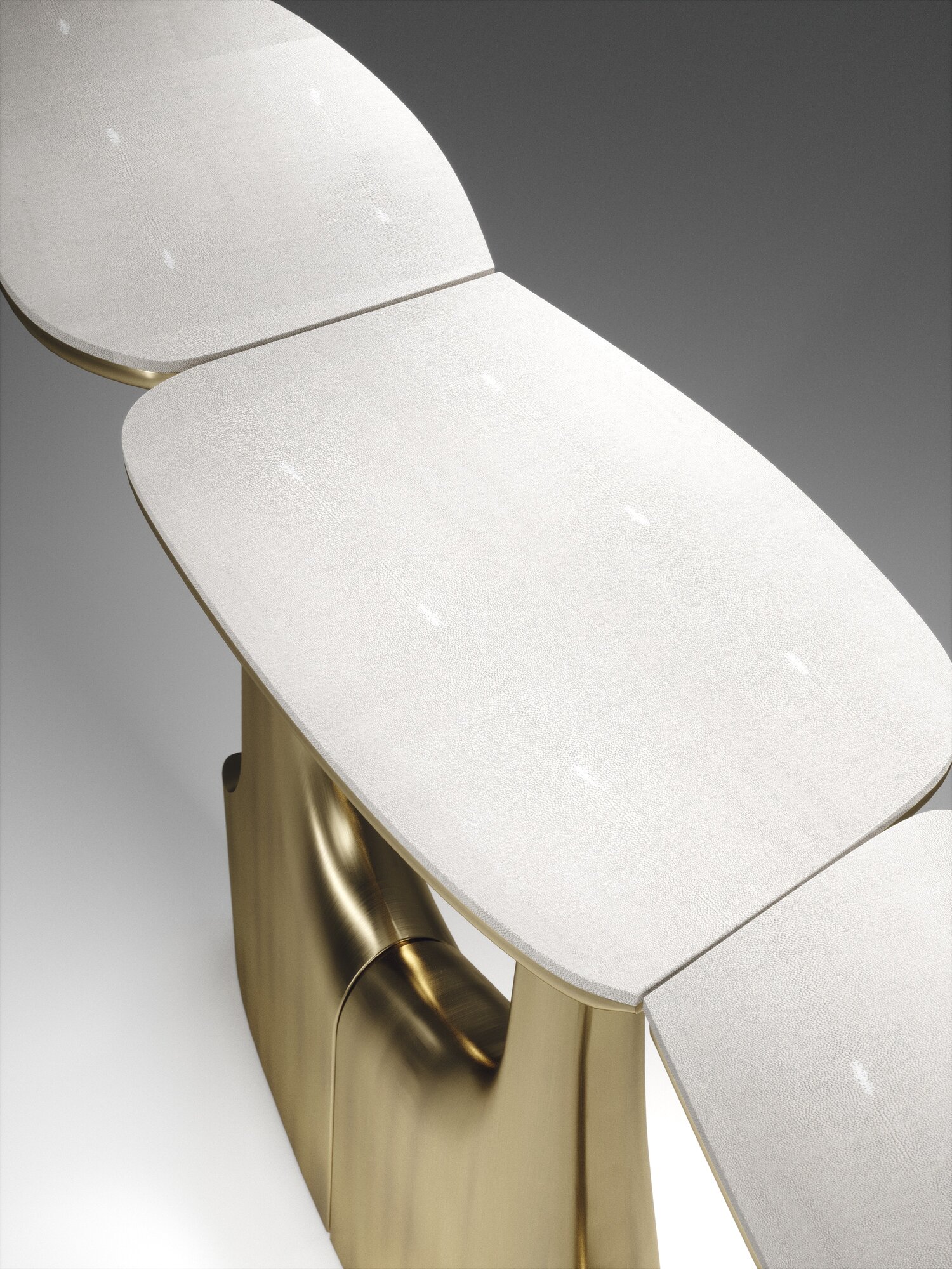 The triptych console table by R&Y Augousti is a stunning multi-faceted sculptural piece. The beautiful hand craved details on the bronze-patina base demonstrate the incredible artisan work of Augousti. The tops are inlaid in cream shagreen. Available in other finishes.