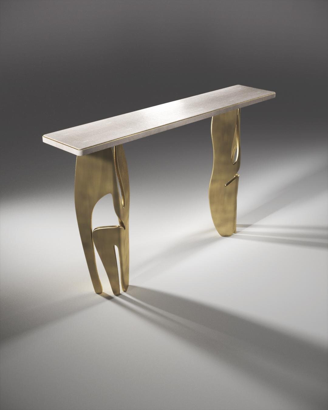 The Metropolis II console by R&Y Augousti is a statement piece. The cream shagreen inlaid top sits on a pair of dramatic sculptural bronze-patina brass legs, showcasing the brand's incredible artisanale work. The top has a discreet metal indentation around the border, adding another elegant and luxurious element to the design.