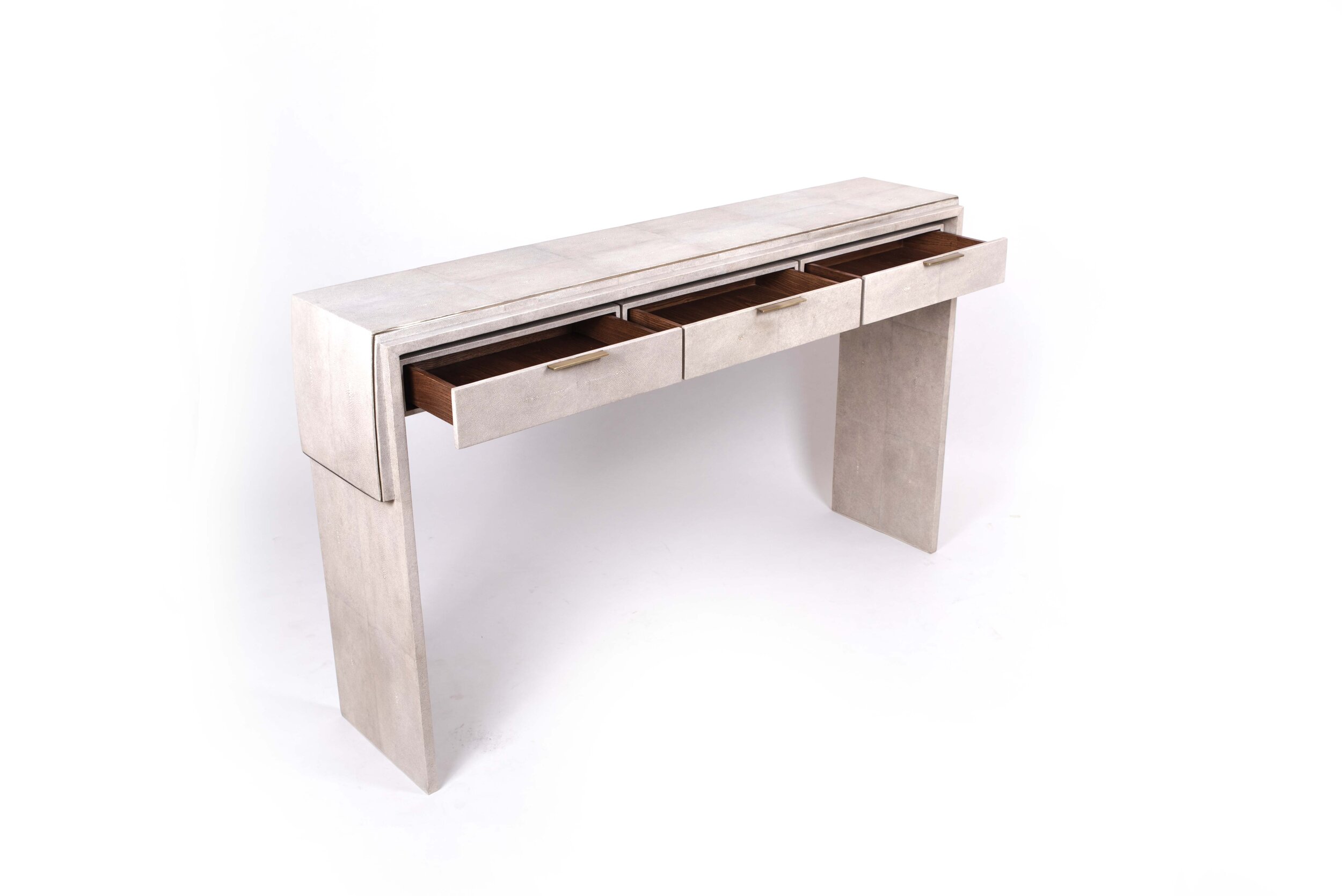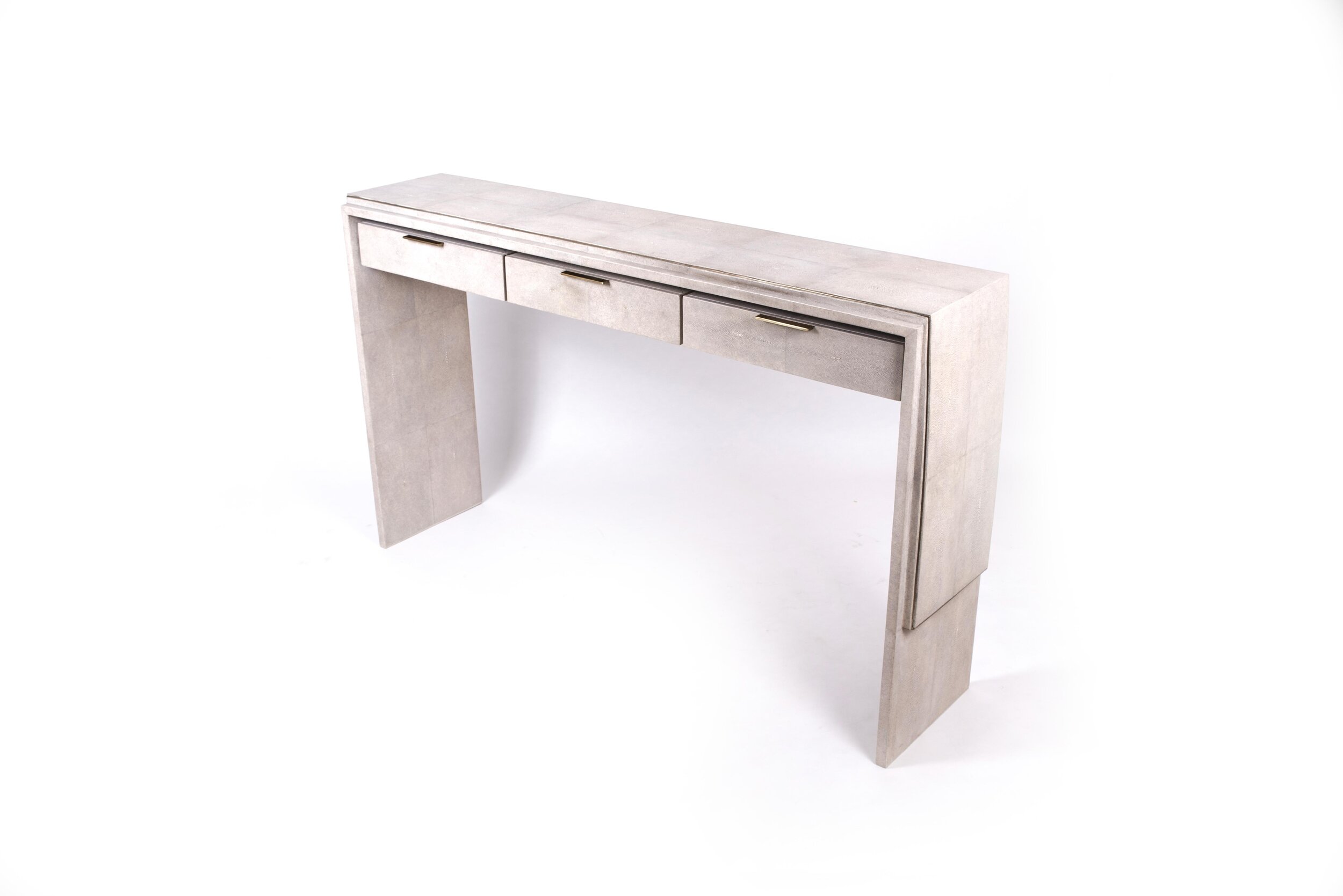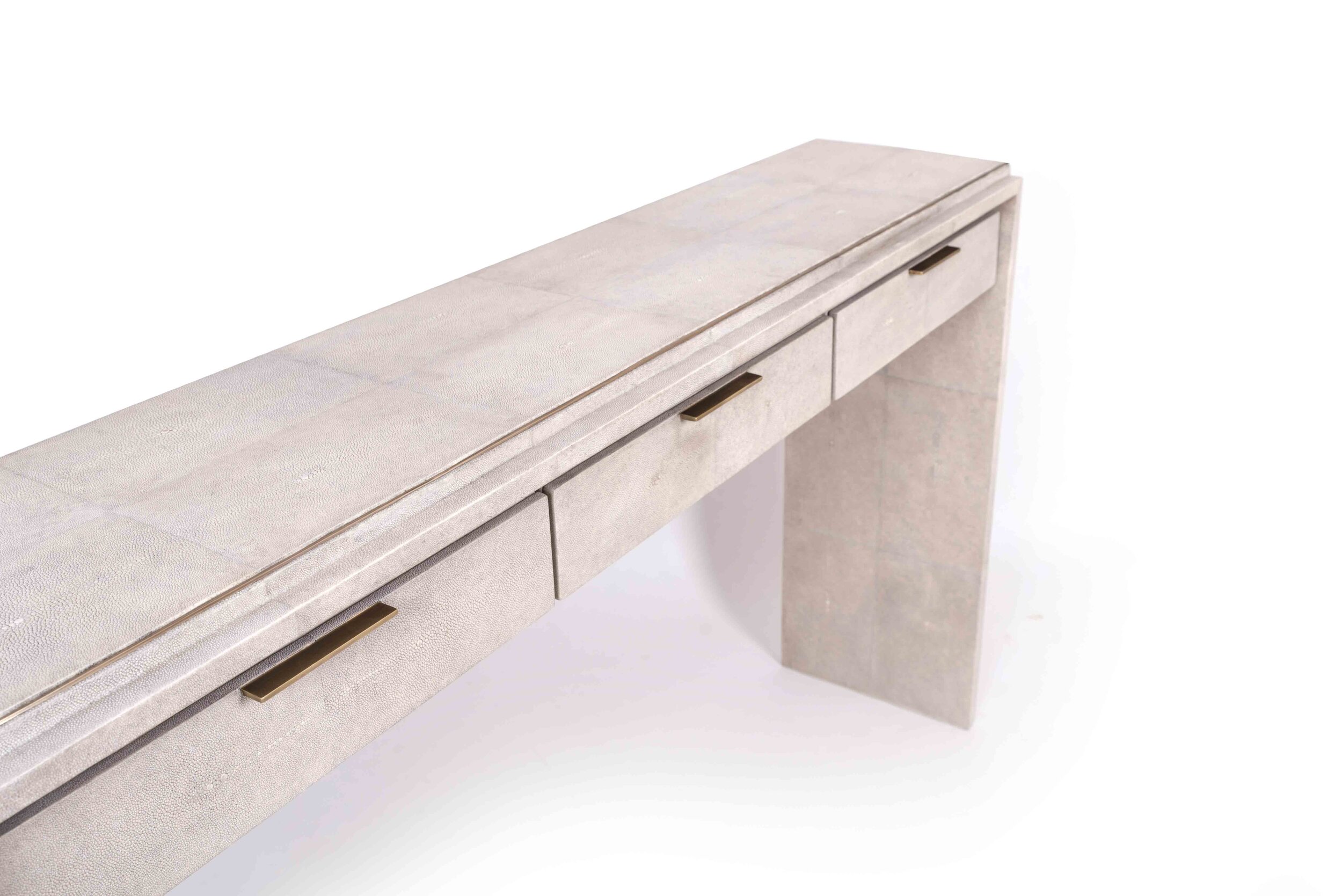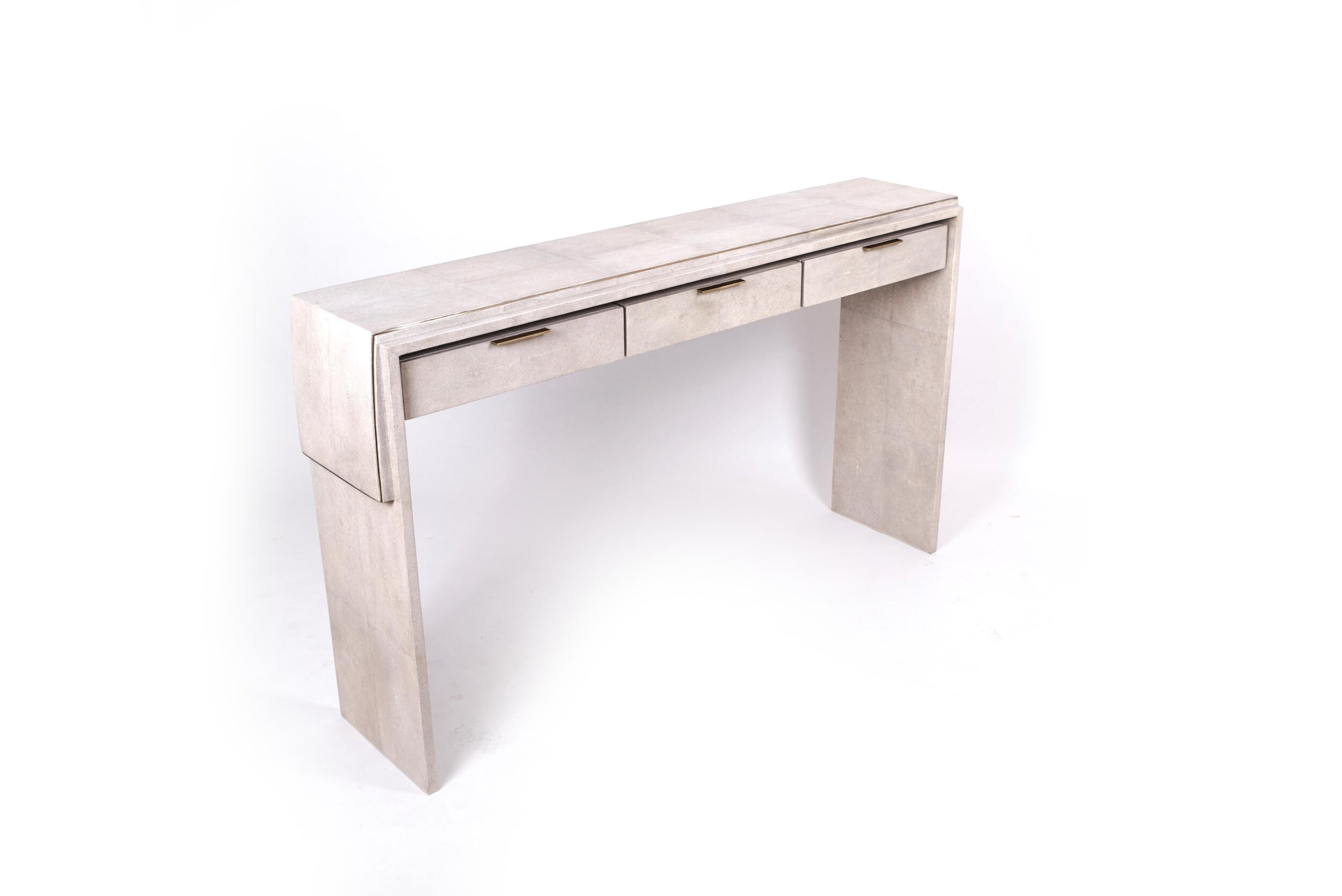 The Waldorf console by R&Y Augousti is an elegant piece with it's asymmetric overlay detail in cream shagreen and the discreet bronze-patina brass metal indentation detailing. This piece includes three drawers that appear as though they are floating with thin bronze-patina brass handles, and inlaid inside with a wood veneer. The shagreen Is hand-dyed by artisans and the designer calls this finish ''antique natural'' shagreen. Custom color and sizing available on request.