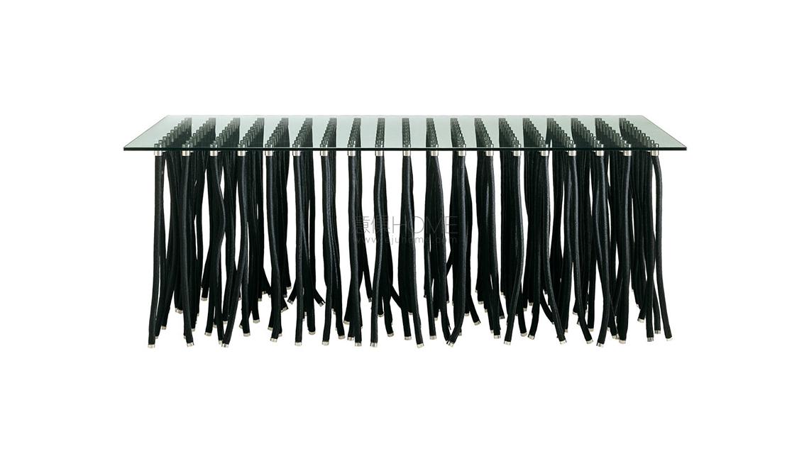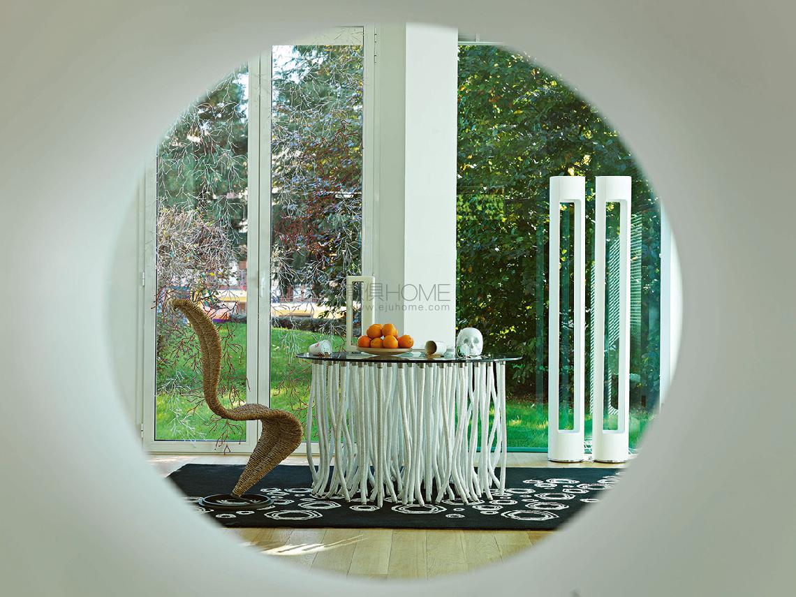 At first glance, the Org table by Fabio Novembre seems an unlikely paradox: the top appears to rest atop elements that hang from above, like tendrils. The internal solidity is hidden from view, thanks to the careful placement of flexible polypropylene rope legs amidst rigid legs equipped with a steel core and rope exterior.