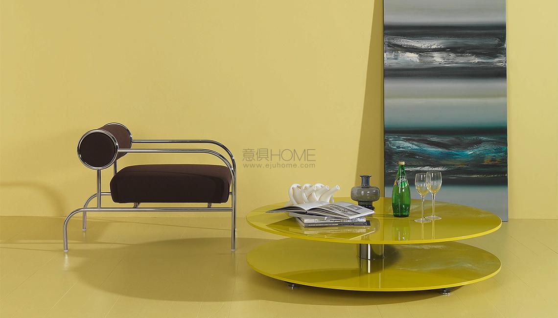 The Altavilla table by Giulio Cappellini is composed of two round wooden tops lacquered in the colours of the collection, with a matte or glossy finish. Both tops are connected with a stem made of polished chromed steel; the feet, equipped with felt pads, are made of polished chromed steel.