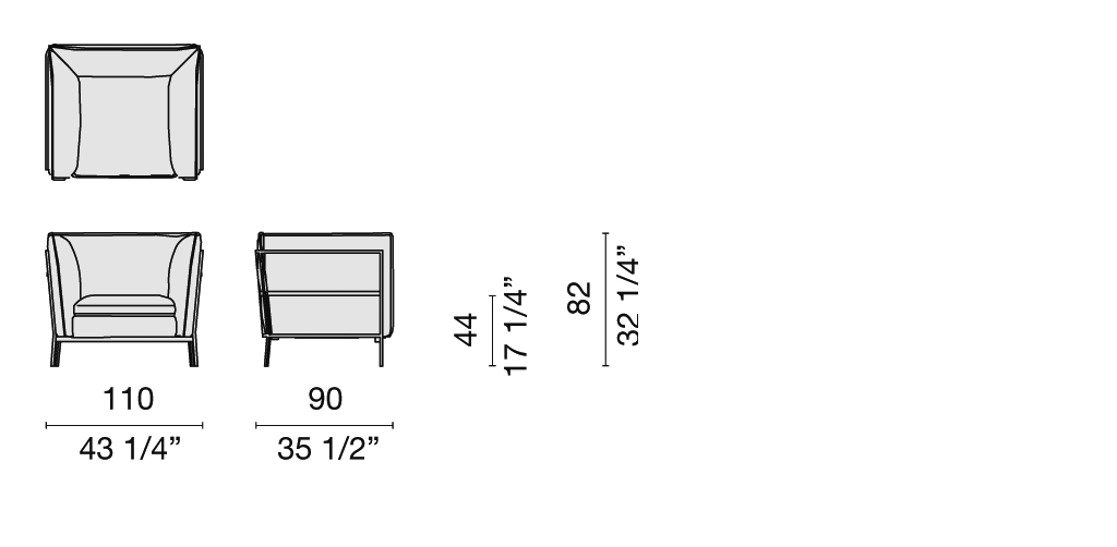 The top cushions are stitched to the large bottom cushion and then fastened to the structure with velcro. The back cushions are interconnected by zipper, and the armrests are sewn to the backrest. The loose back and arm cushions are identical in size and density.