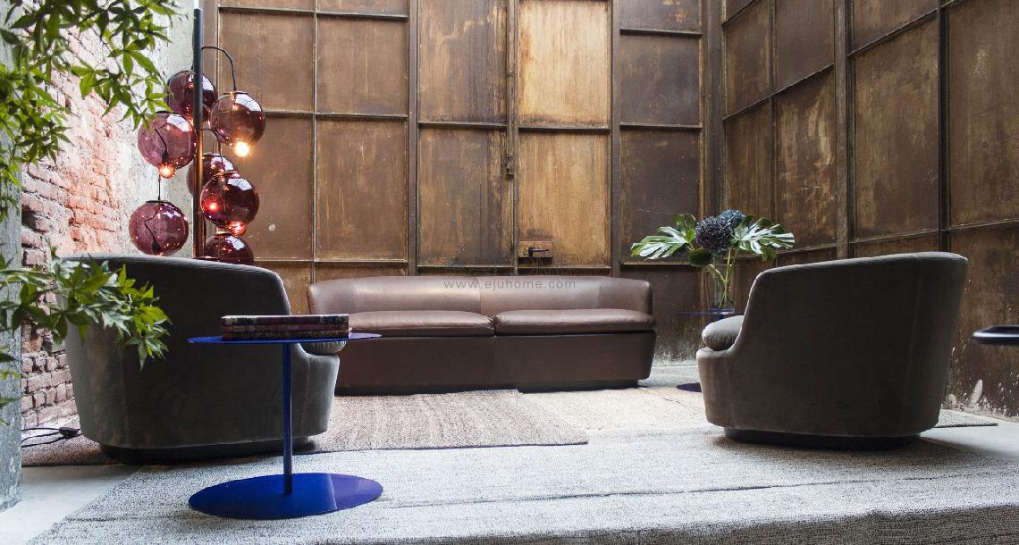 The collection is composed of two and three-seaters, a rounded sofa (right or left), small or larger armchairs (fixed and swivelling), poufs. As of 2019, the family also includes a small two-seat sofa.