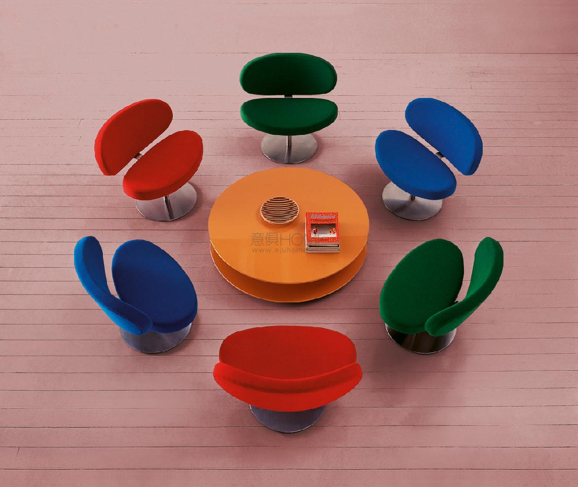 The Sunset armchair by Christophe Pillet has a swivelling design and backrest and seat made of curved beech wood; the base is made of satined stainless steel and is also available with a matte lacquered finish in white, mud or anthracite.