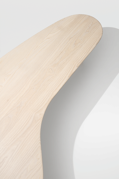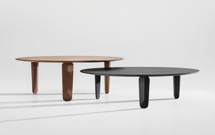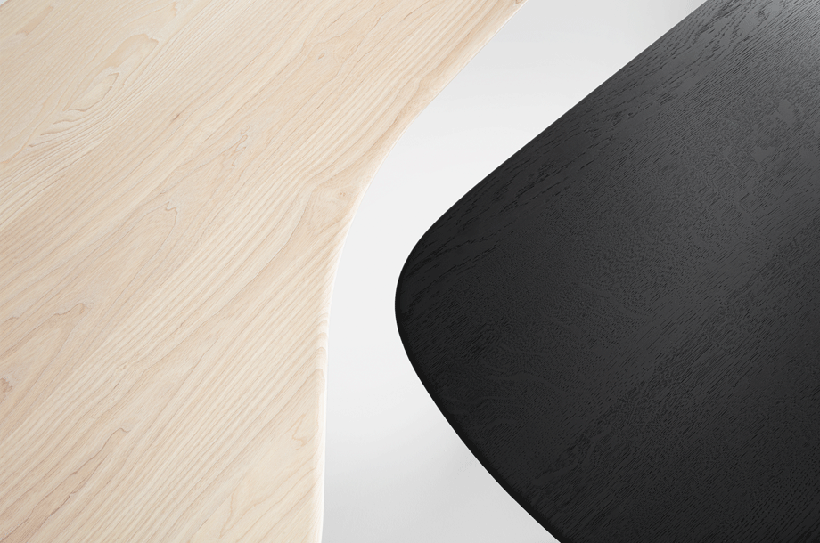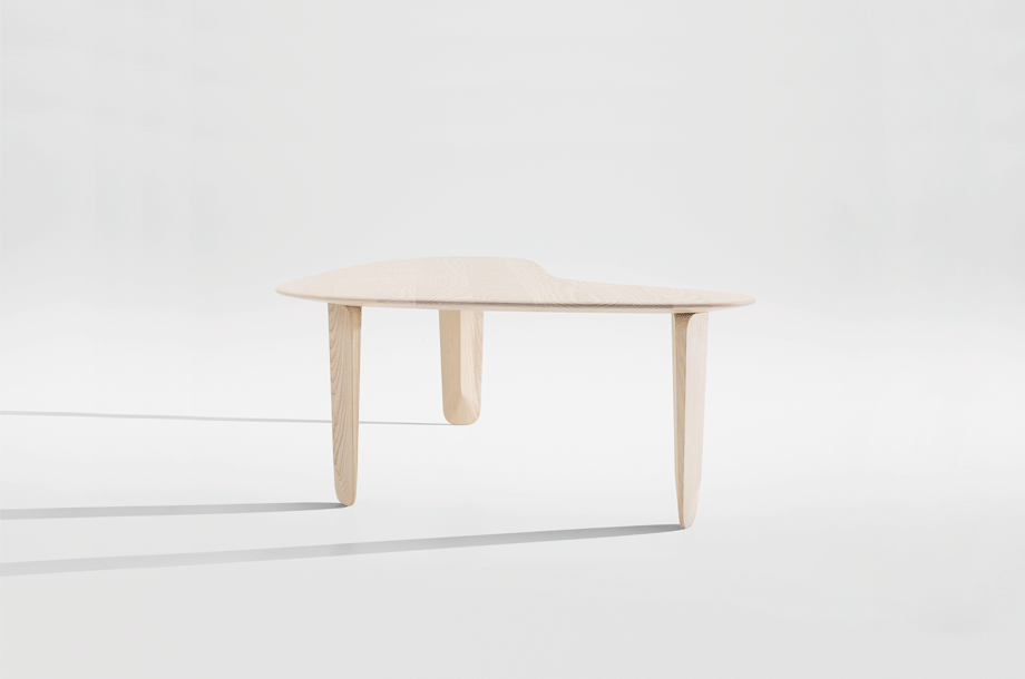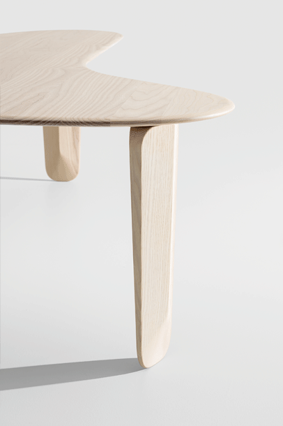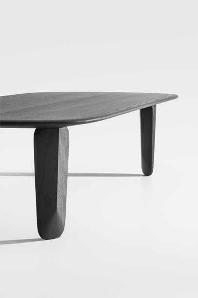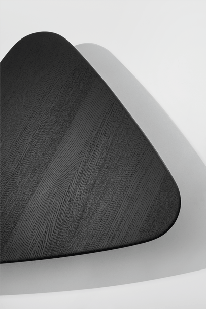 Inspired by and abstracted from African masks, precision cut table legs have been created to carry the table top. The cut diamonds of solid wood appear sculpturally powerful and at the same time seem to float. The four archetypal shapes of the table top invite a geometric interplay: Triangle, circle, rectangle and free form take over the design of the room. Due to the two heights, different shapes can be combined and overlapped, creating exciting formations.