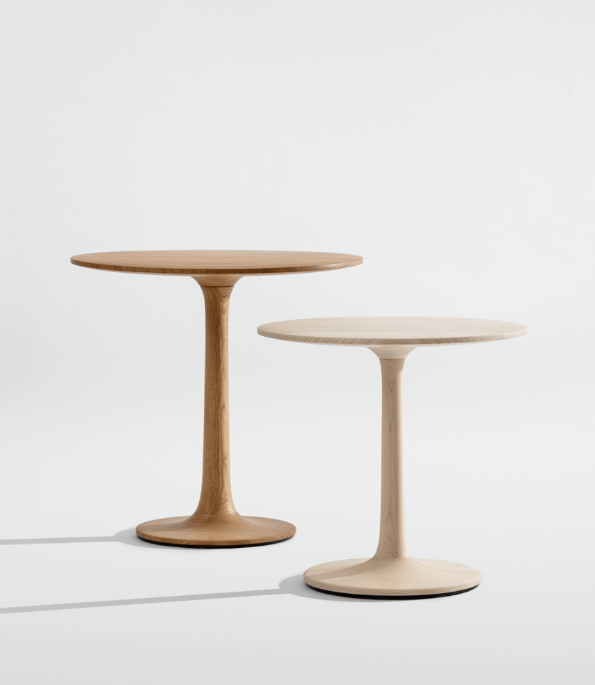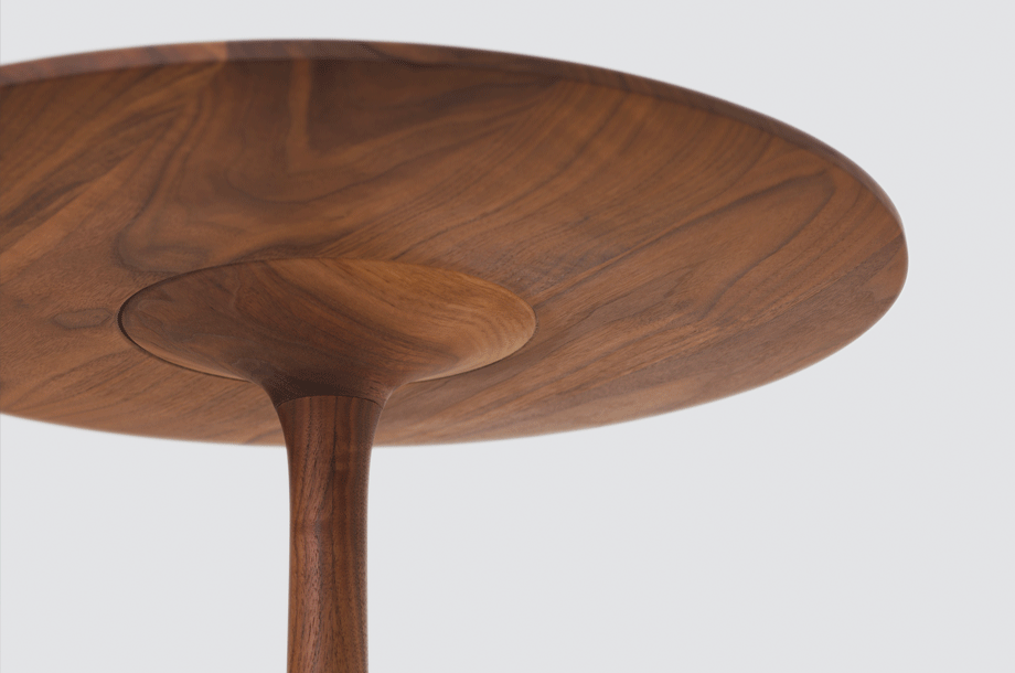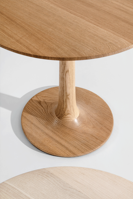 The archaic form of this table speaks for itself. It owes its unique identity to the feeling that it turns around its own axis. It is present in the room as a feature and fixed on its slim-line middle foot in solid wood. To all appearances, this round table has been carved from one piece of wood. Wherever you place it, TURNTABLE is always in the right place.