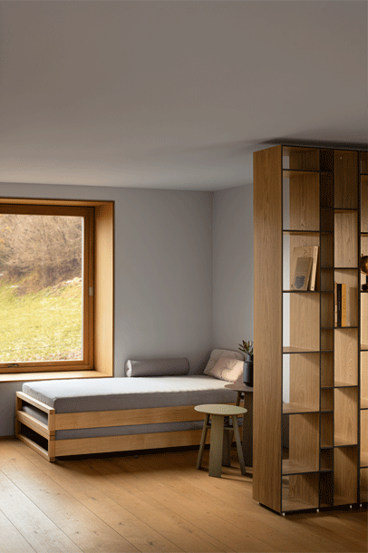 GUEST is a solid, simple stacking bed. For guests, for the teenager room and the holiday home. Two beds stacked, without fixings, make a wonderful couch for the daytime which can be made cosy with large cushions. Suitable as a permanent and double bed.