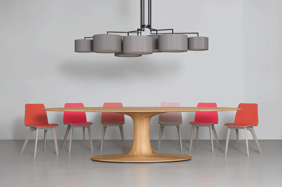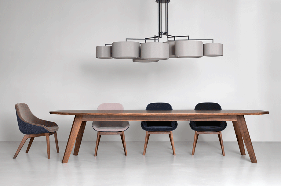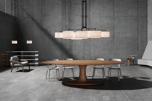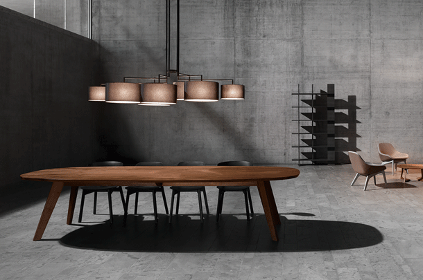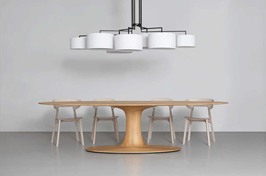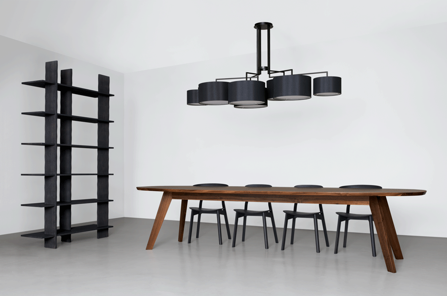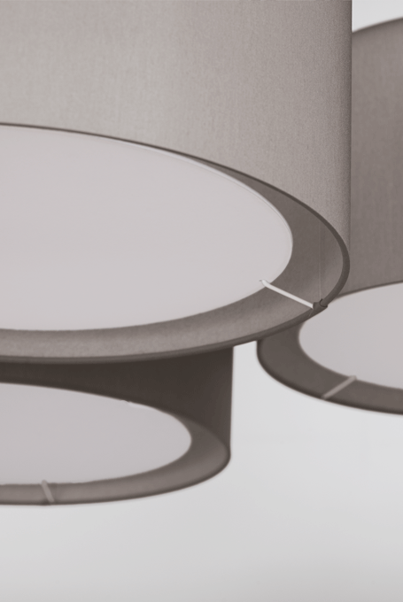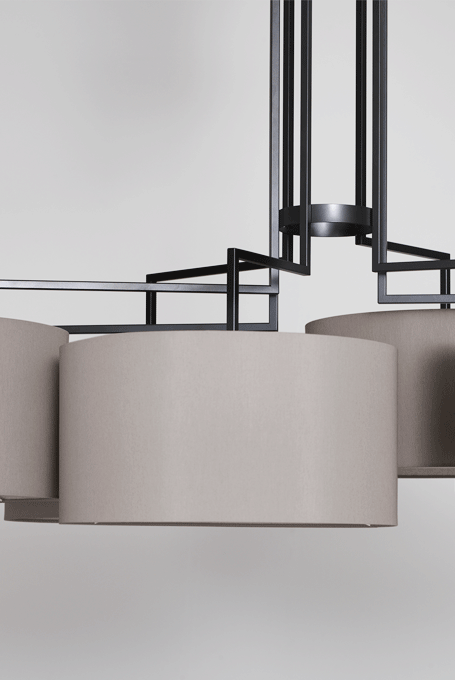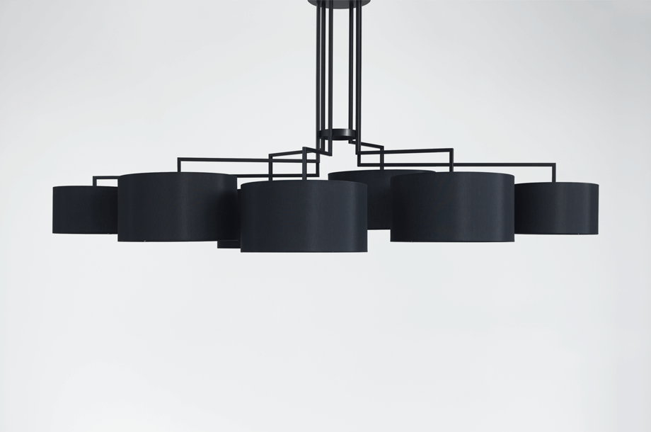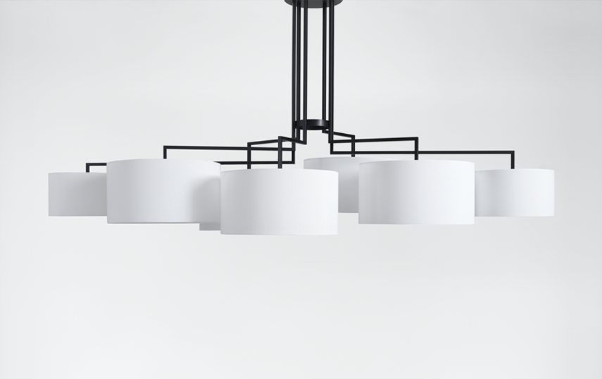 NOON 7 appreciates any big table and the lobby. The desire for simplicity and the pleasure in pure design led to a geometrical abstraction of natural branch forms. The NOON range of lamps is rigidly constructed, the textile lampshades give a soft light. The matt black or matt white powder coated finish gives the iron a soft and warm appearance. The intrinsic value of the lamps is a product of material and hand-crafted details.