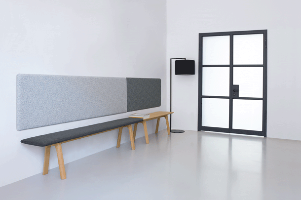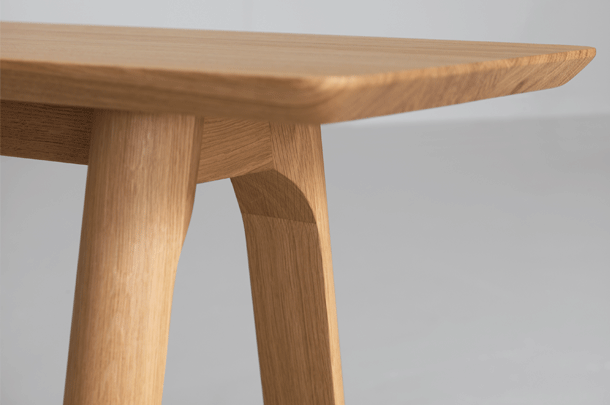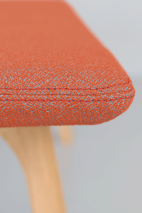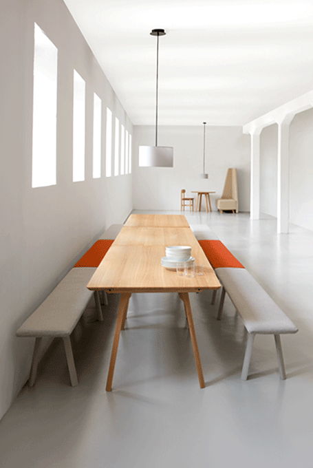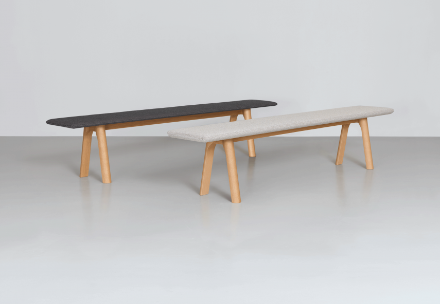 RAIL Bench – the bench fits the table RAIL. The frame with its solid wood legs running diagonally outwards is stable. The semicircular cross-section of the legs provides a soft contour. RAIL Bench is available with wooden seat and close upholstery.