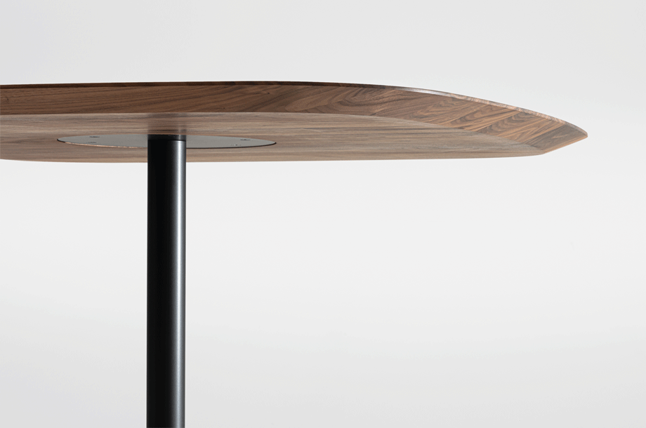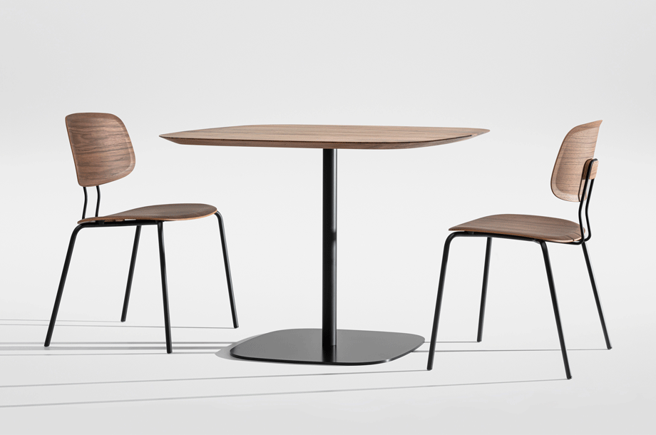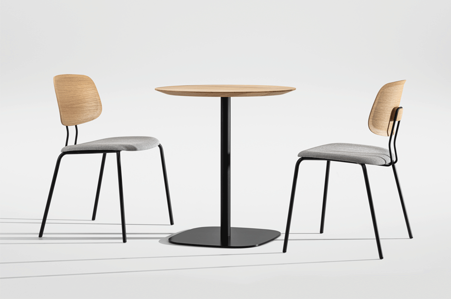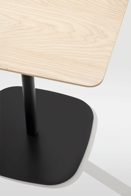 VERMU is characterised by its stable stand. The reduced, square base plate with its rounded corners can be combined with all tabletop shapes –whether round, square, rectangular or convex. The central, slender central foot ensures maximum legroom, the solid iron footplate ensures stable standing. The satin-matt powder-coated surface also ensures high durability in the building. The solid wood table top has a light and elegant appearance due to its profiled edge.