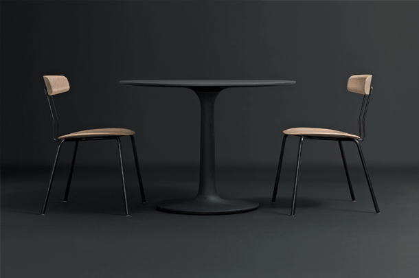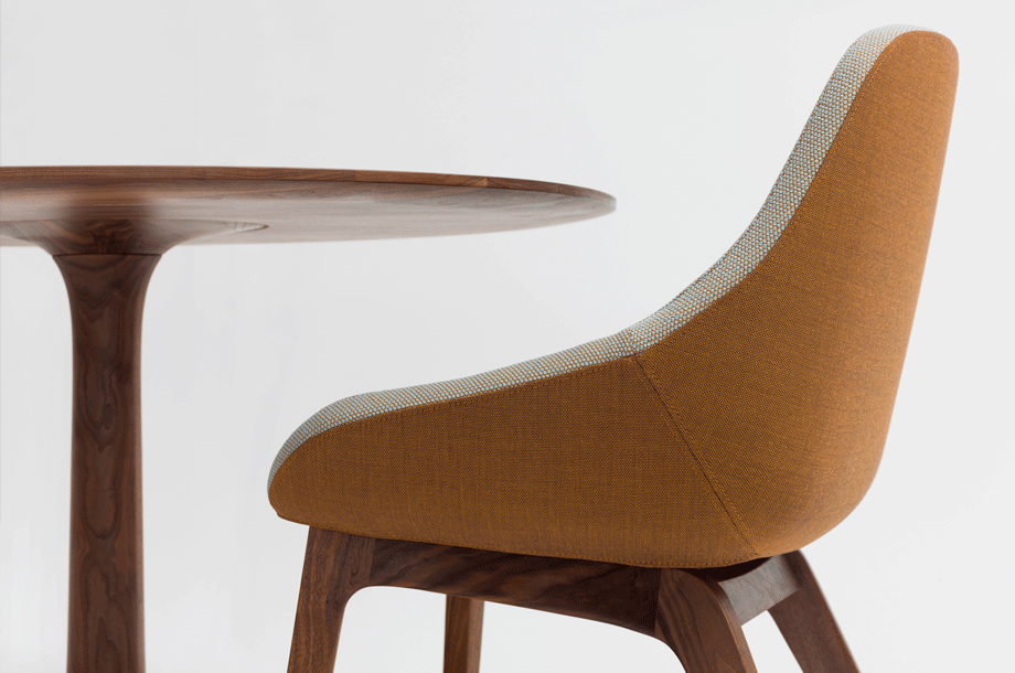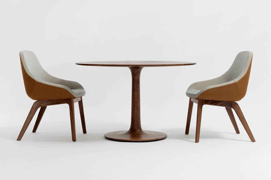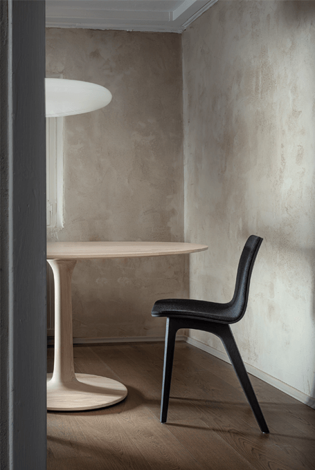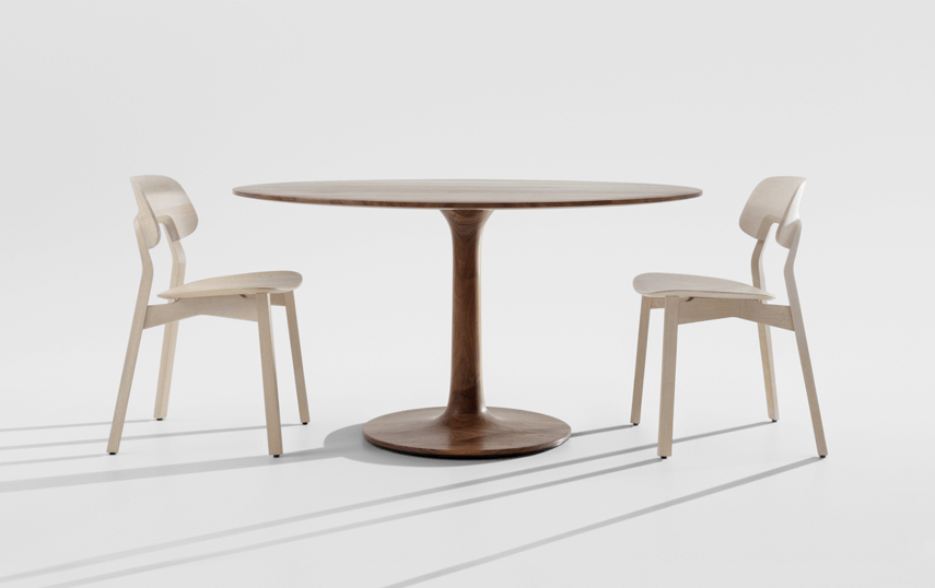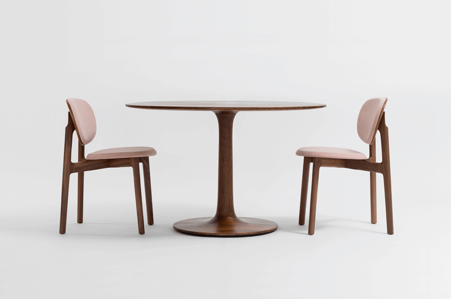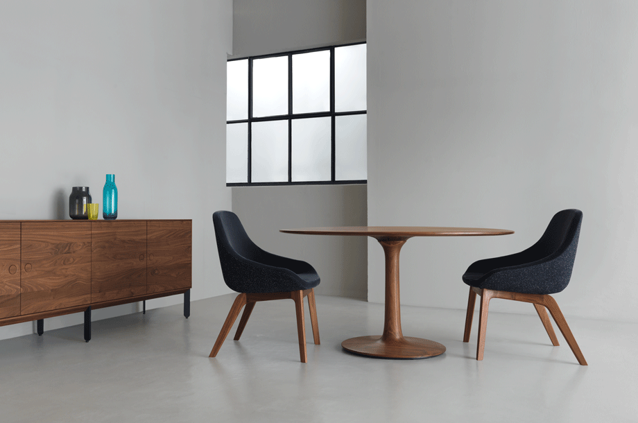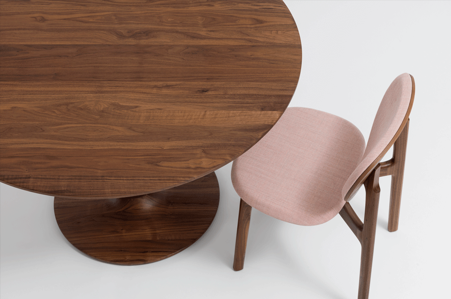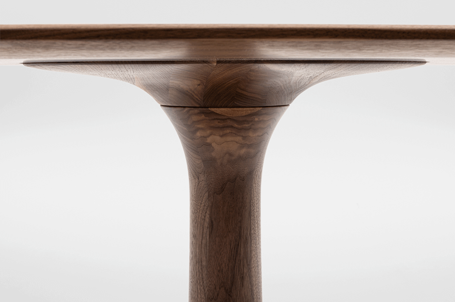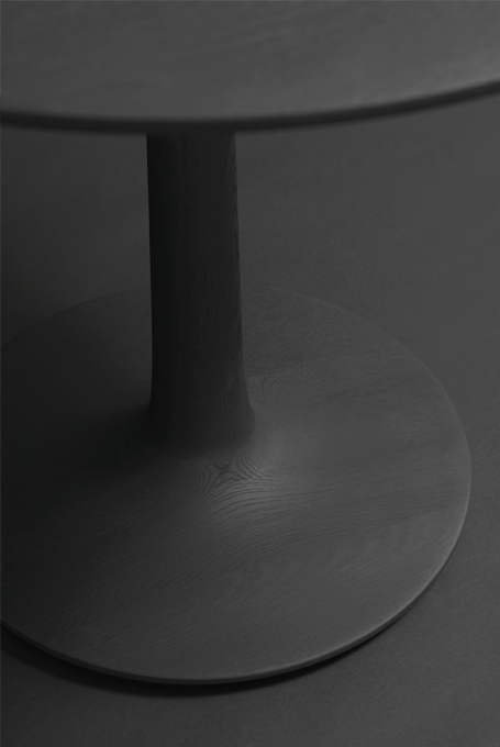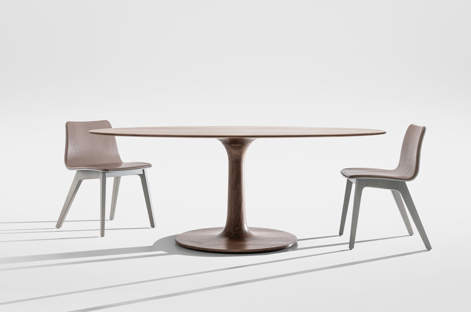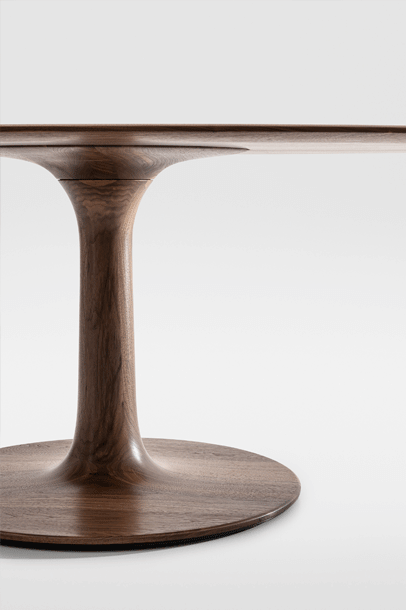 The archaic form of this table speaks for itself. It owes its unique identity to the feeling that it turns around its own axis. It is present in the room as a feature and fixed on its slim-line middle foot in solid wood. To all appearances, this round table has been carved from one piece of wood. Wherever you place it, TURNTABLE is always in the right place and is always a focus of attention.