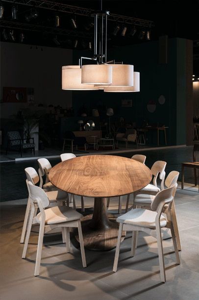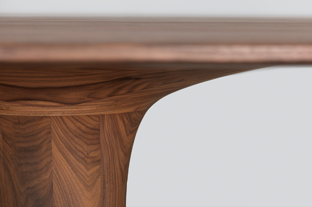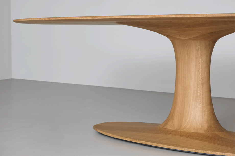 TURNTABLE OVAL – the oval table for large groups. This larger format was developed based on the round TURNTABLE, providing more seating and nevertheless saving space with a centre base. The table top, the centre base and the floor plate are oval. This form requires a very sophisticated level of craftsmanship and is unique as a solid wood version.