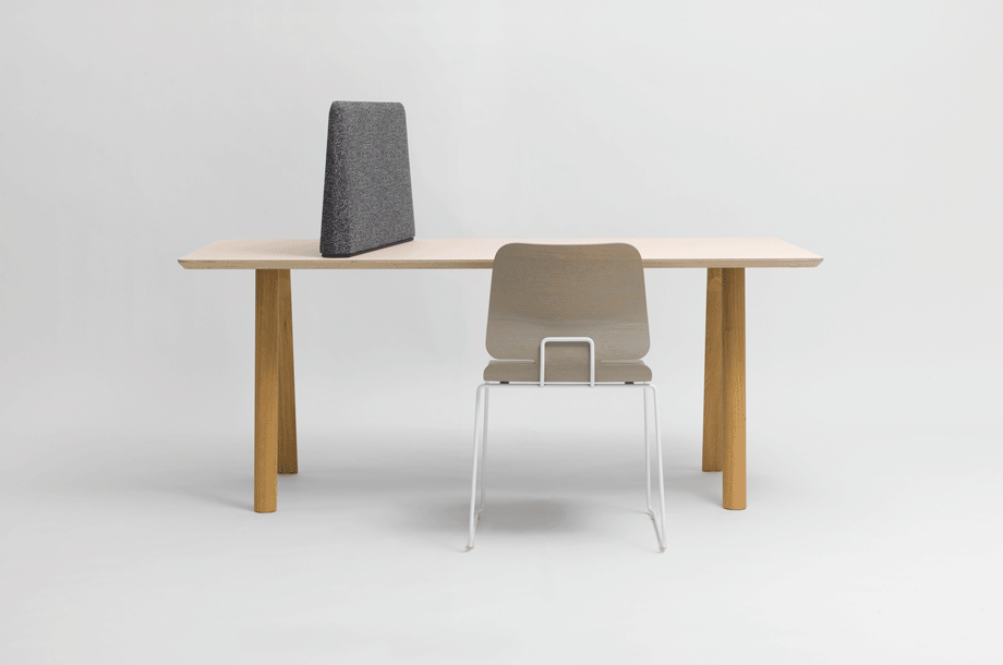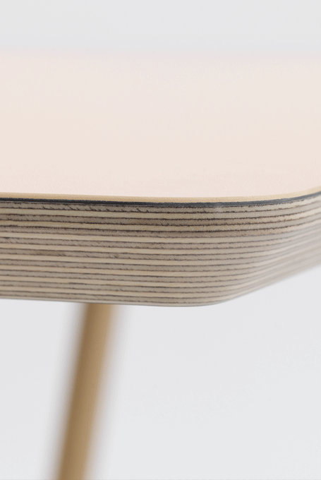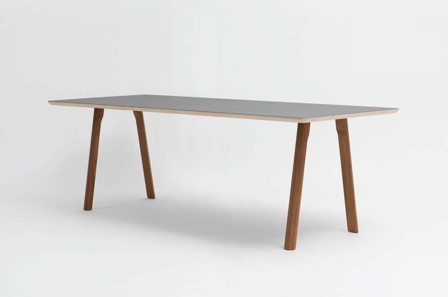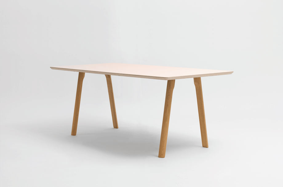 A table top and four separate legs. The slightly splayed legs with the typical RAIL half-round profile are fastened to the underside of the table by means of an iron support plate.The table top is made of Multiplex with a visible edge, the corners are rounded. The counteracting paper on the underside is matt brown.