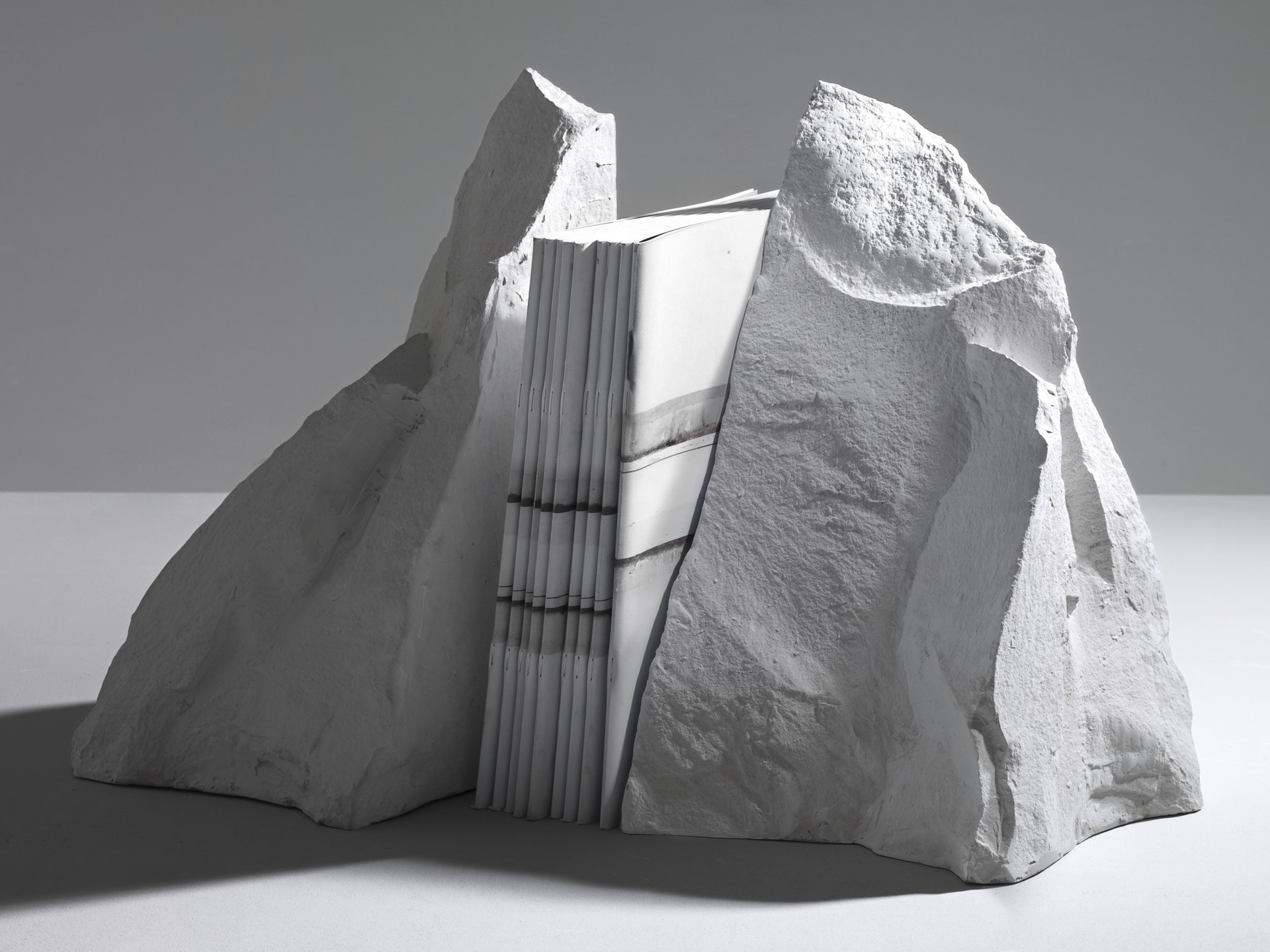 Un reggilibro che sostiene con la forza di roccia di cui imita le fattezze, e al contempo arreda con la leggerezza di piuma che la vetroresina gli dona.