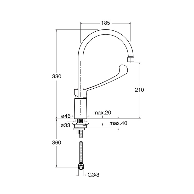 Miscelatore monocomando cucina, bocca alta orientabile, monoforo da piano, con miscelazione meccanica frontale, leva clinica soft touch, H. 330 mm