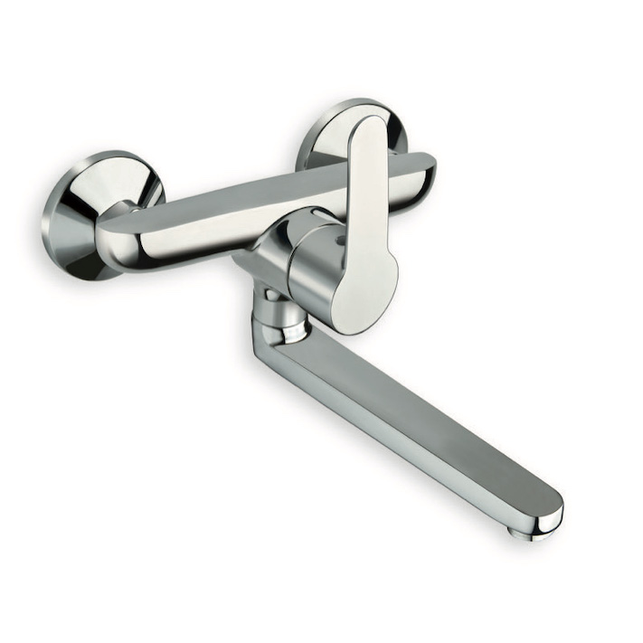 Miscelatore monocomando cucina, bocca orientabile, a parete, con miscelazione meccanica frontale, leva piatta. Punto di erogazione 238 mm