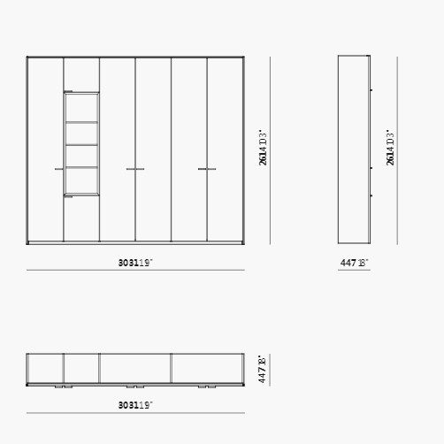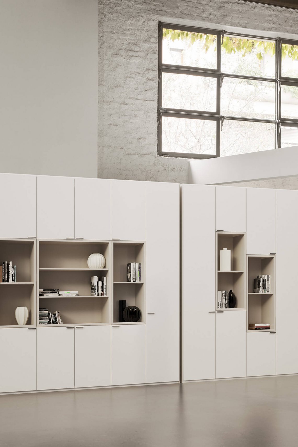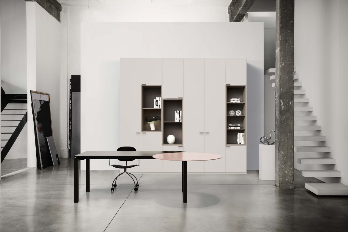 Quadronno is a storage unit range available in two types: against a wall or as a dividing storage wall. Thanks to it’s compositional flexibility, it addresses every type of environment, with numerous finish customisations that make it almost a tailor-made programme. Possibility of alternating full-height doors, lacquered open units, drawers that can be fitted with pull-out frames to facilitate filing.