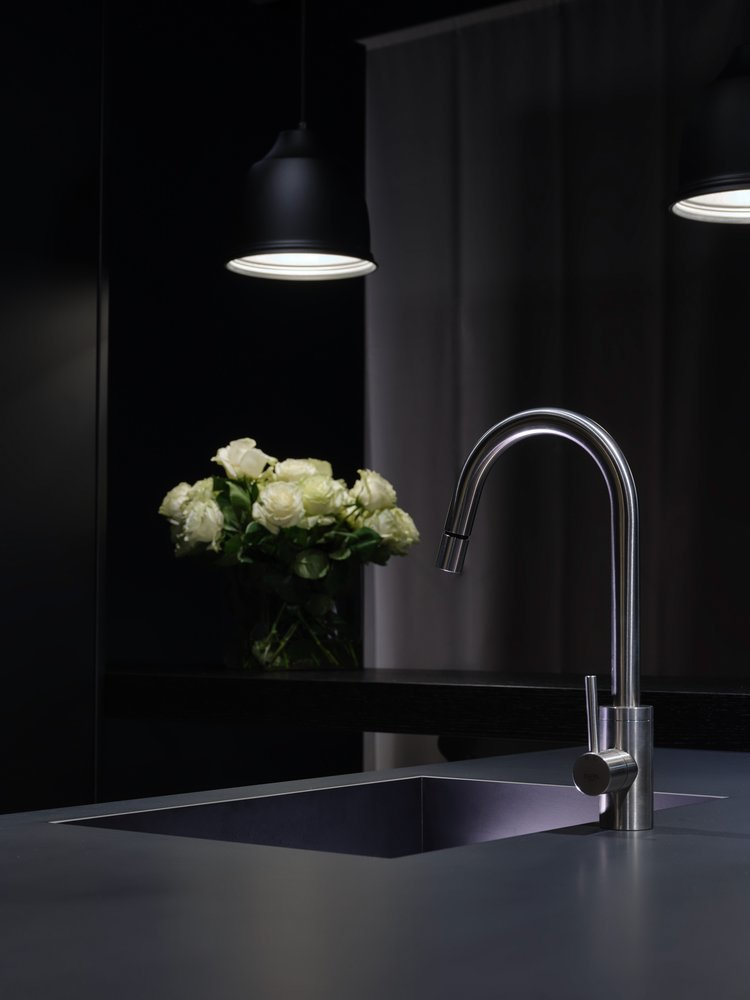 Finitura mobili isola e quinte: cemento nero spatolato a mano.