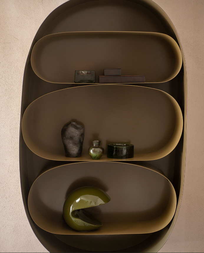 Astral is a metal cabinet forming part of Cosmic: Toogood’s collaborative collection with Tacchini. Like the other pieces in Cosmic, Astral celebrates irregular and elliptical shapes. Faye Toogood’s process is predominately rooted in hand-making maquettes out of everyday materials. The contours of Astral were first discovered in pliable aluminium mesh, then scaled up in steel. Like the Orbit tables or Lunar lights, the cabinet features soft shapes within shapes. Astral is designed with the playful and organic approach of the Toogood studio. Sculptural forms that unite the artistic with the everyday. The cabinet’s curves trick the eye and at first glance it appears Astral has no straight lines. The shelves are of course level and functional, ready for you to fill with your own curiosities.