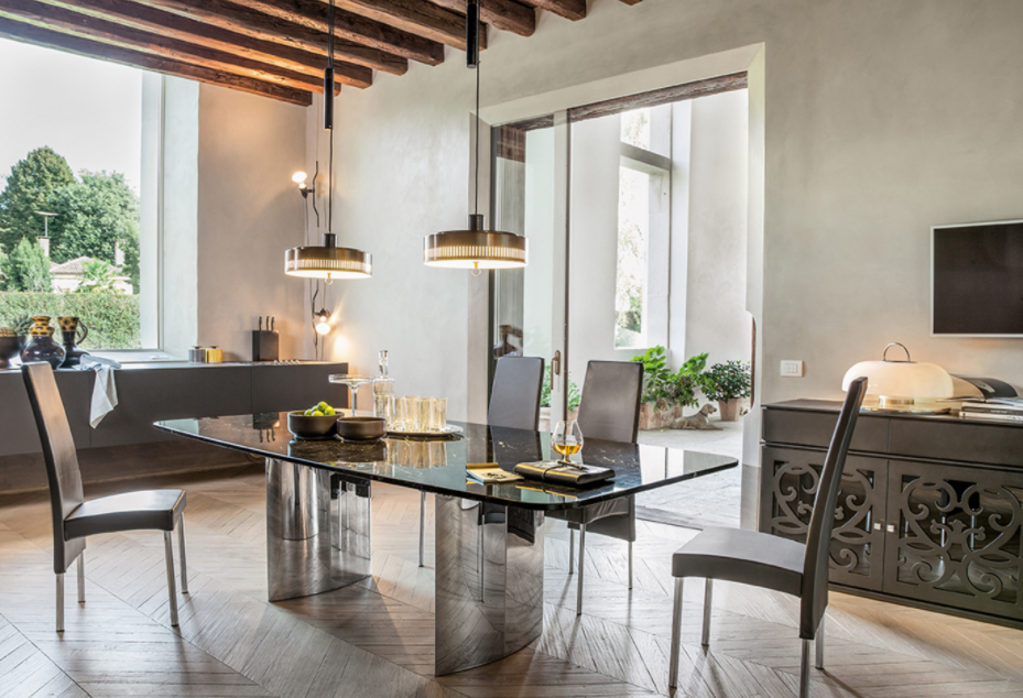 Manhattan, un tavolo dalla linea profondamente elegante ed intramontabile, con una solida base in acciaio inox, un telaio cromato e piani in legno, marmo, vetro o gres porcellanato. Un tavolo capace di trasportarti immediatamente nella metropoli più bella del mondo.