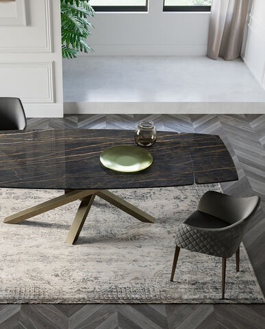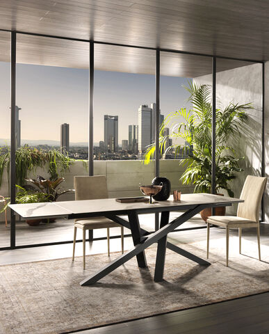 Il tavolo Atlante è interamente in legno, disponibile nelle finiture noce canaletto e rovere coke termo-trattato. Le gambe a cavalletto della larghezza di 17 cm gli conferiscono un aspetto maestoso. La bisellatura del piano mette in risalto le calde venature del legno. Il tavolo è dotato di un sistema di allunghe con guide in alluminio anodizzato. Le allunghe, da 40 cm, sono interne in biglia con il piano.