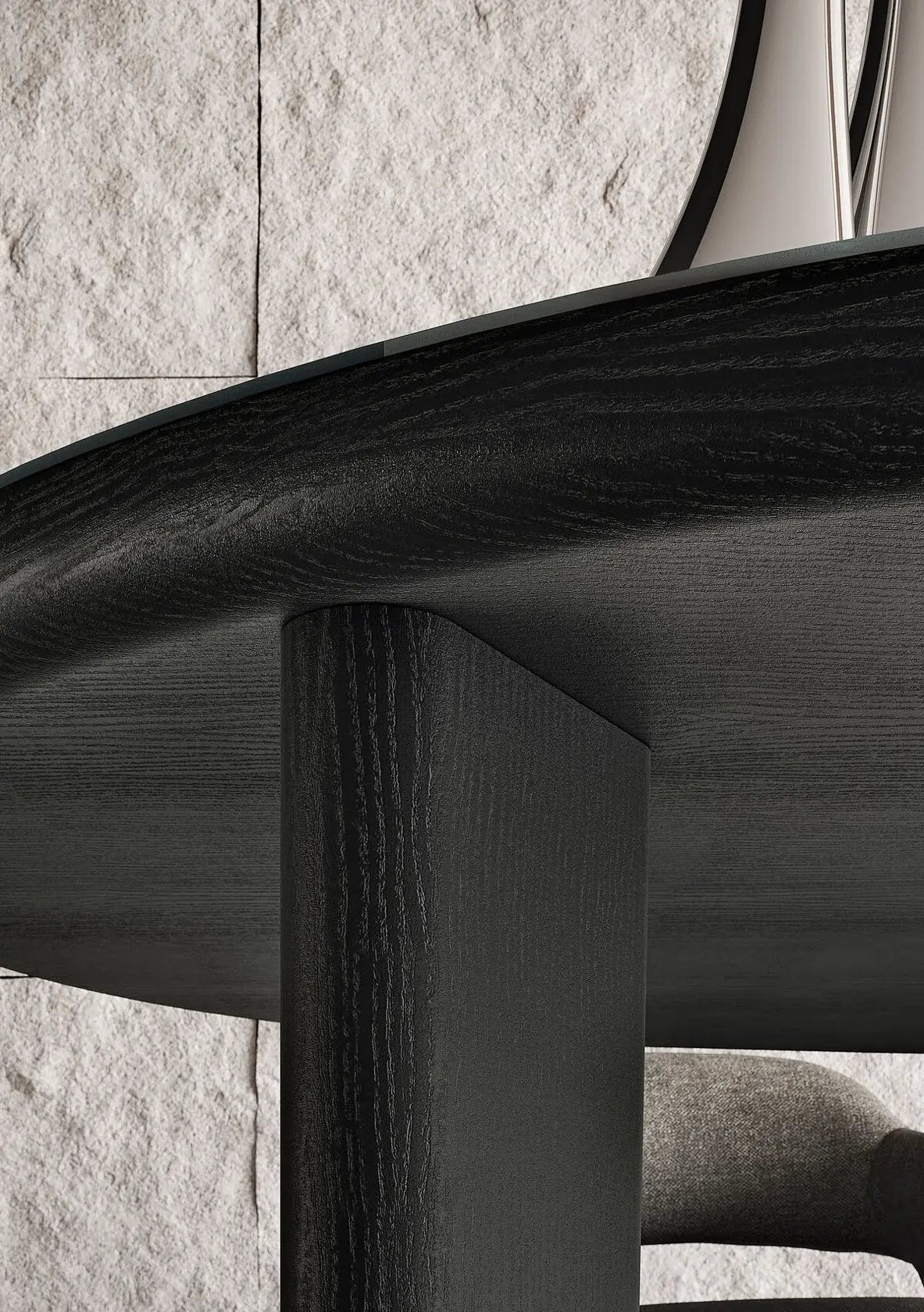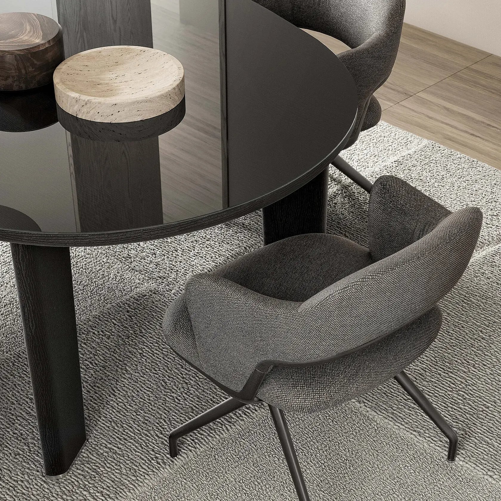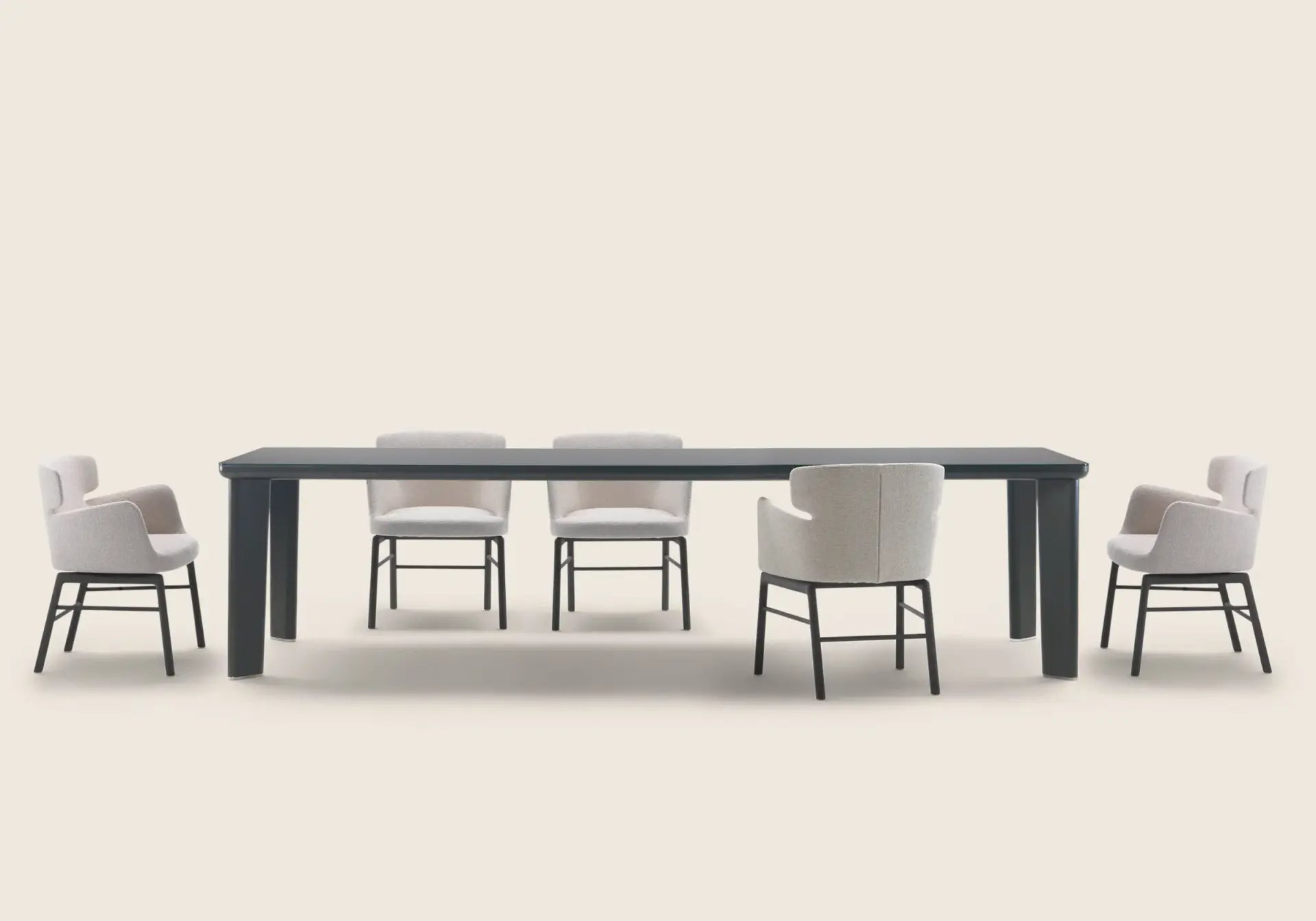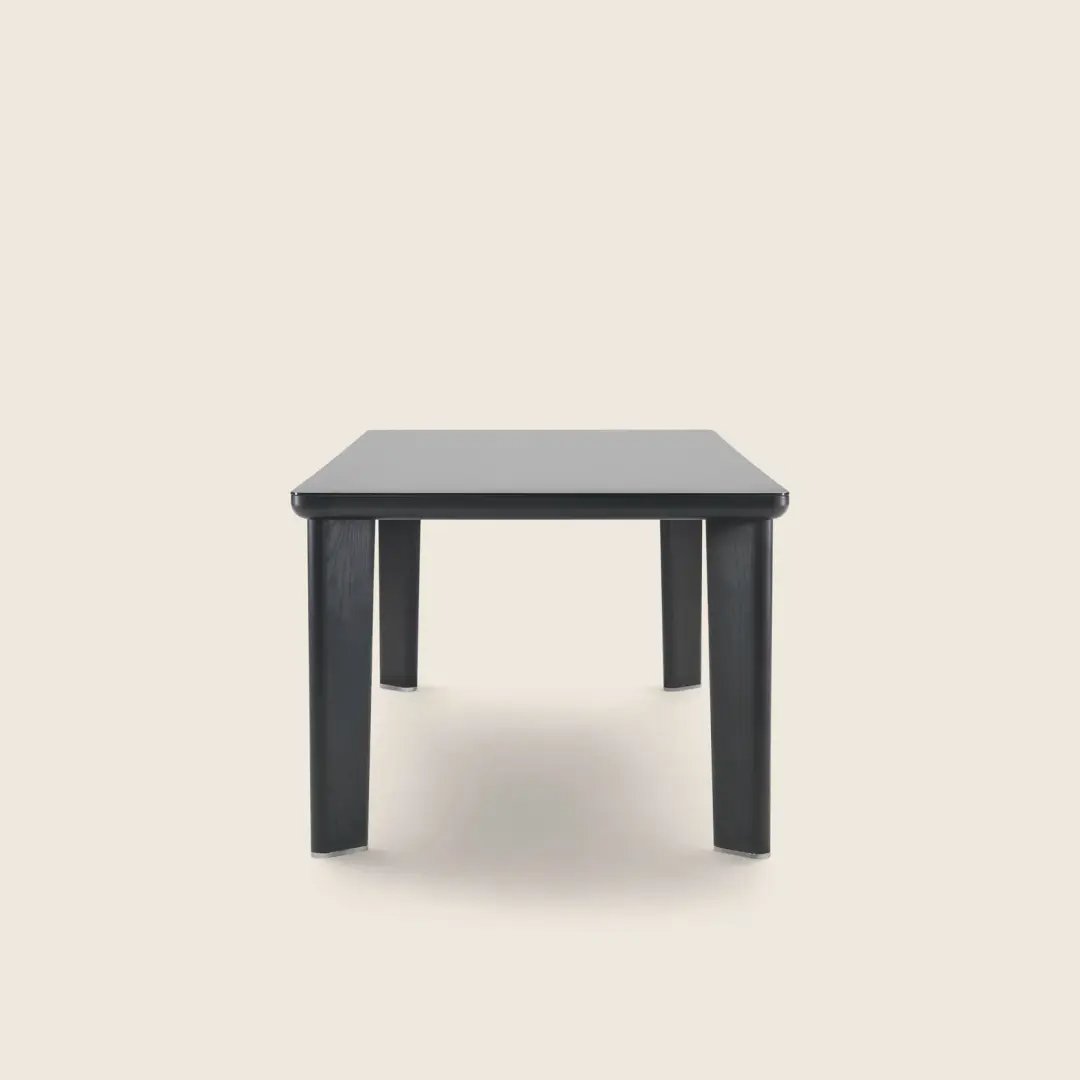 While the design is based on a single-material concept, in addition to veneered wood, the tabletop is also available in back-painted glass, in a palette of sophisticated colors.