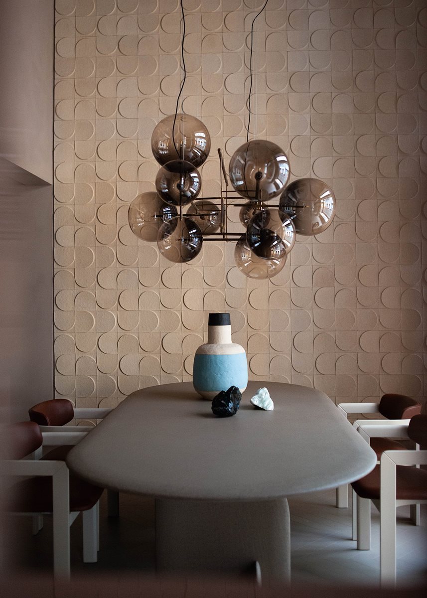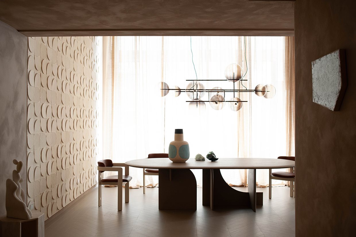 Tavolo realizzato applicando polvere di pietre naturali attraverso una tecnica di spatolatura manuale. Disponibile nei colori "bruciato" e "crema". Trattandosi di una miscela di pietre naturali polverizzate, non si garantisce un’uniformità nelle tonalità cromatiche.