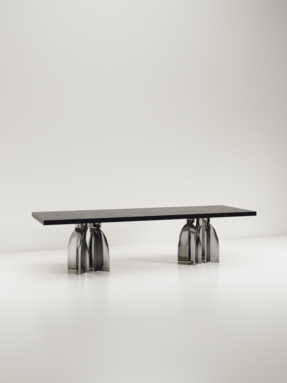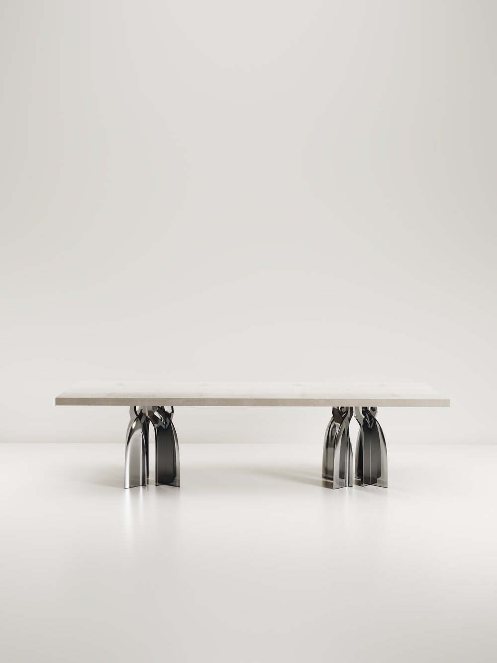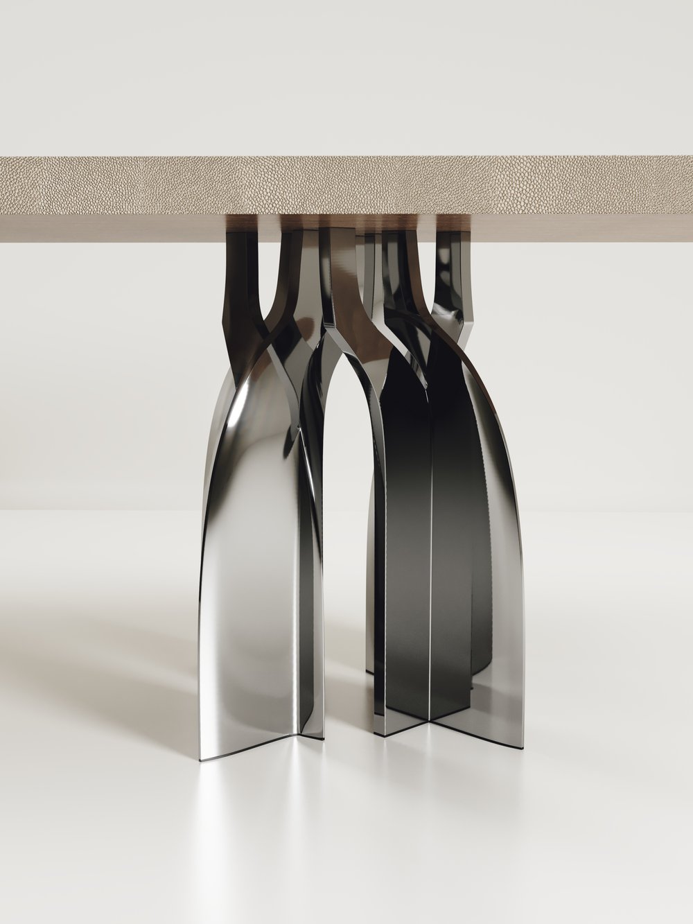 The Chital Dining table is a stunning piece, a statement in any space. The black pen shell or antique natural shagreen inlaid top is sleek and dramatic, and followed by a new chrome finish polished stainless steel sculptural legs clustered together as the base. This piece is designed by Kifu Augousti, the daughter of Ria & Yiouri Augousti. Available in other finishes and as a round breakfast table version.
