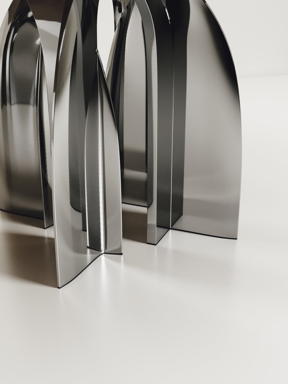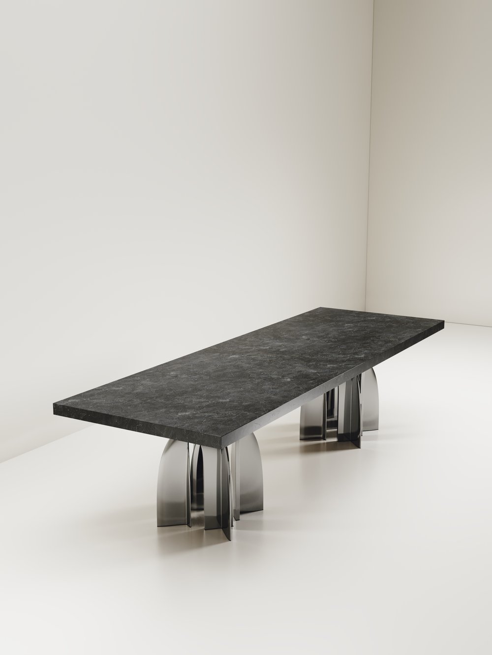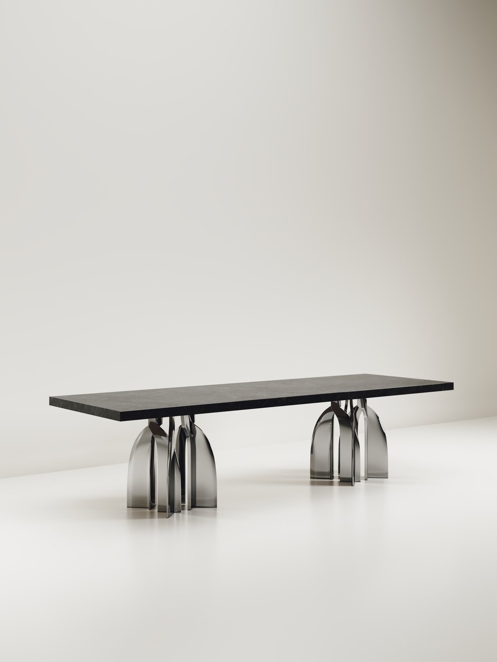 The Chital Dining table is a stunning piece, a statement in any space. The black pen shell or antique natural shagreen inlaid top is sleek and dramatic, and followed by a new chrome finish polished stainless steel sculptural legs clustered together as the base. This piece is designed by Kifu Augousti, the daughter of Ria & Yiouri Augousti. Available in other finishes and as a round breakfast table version.