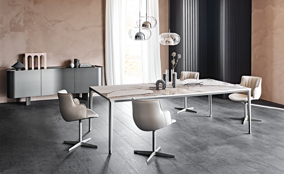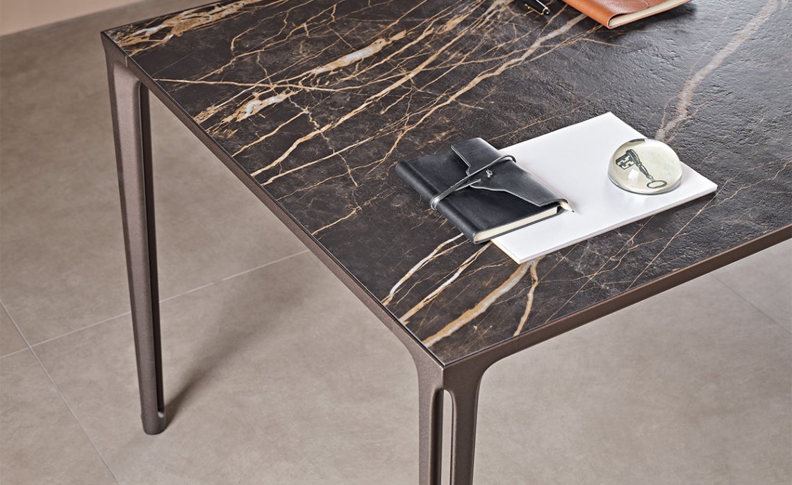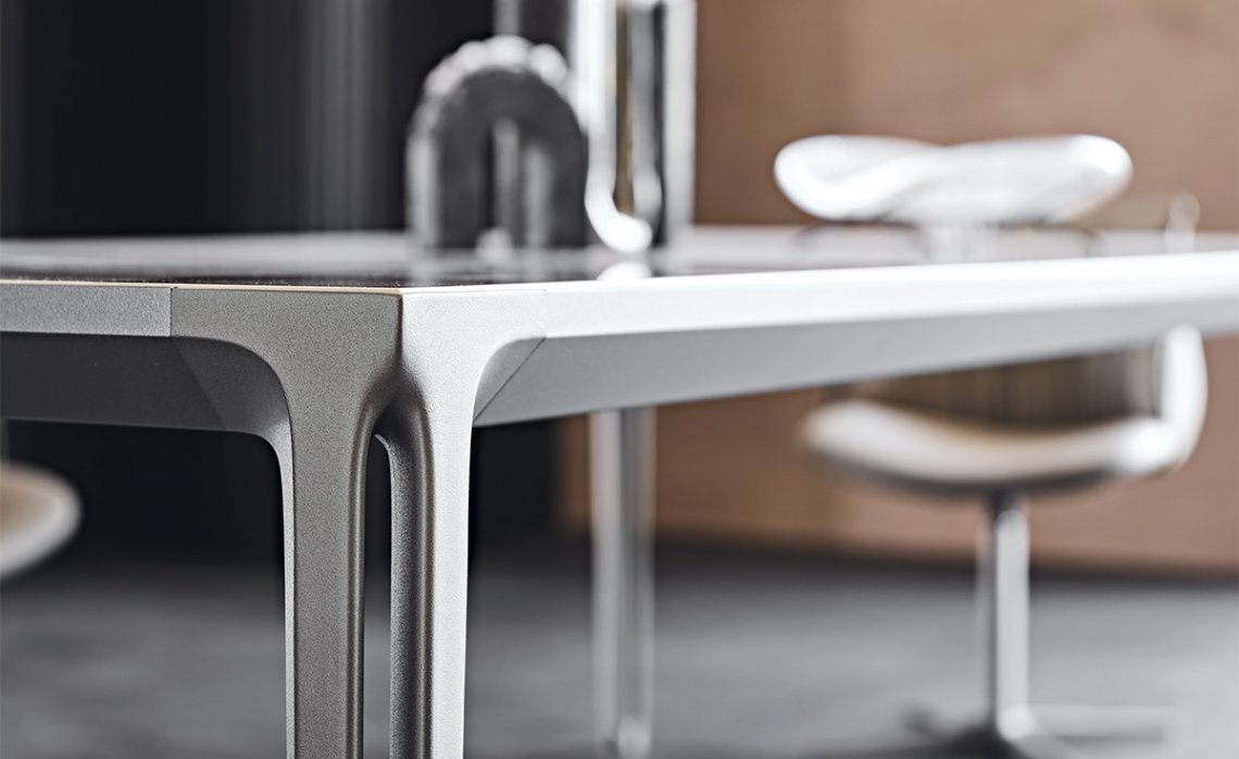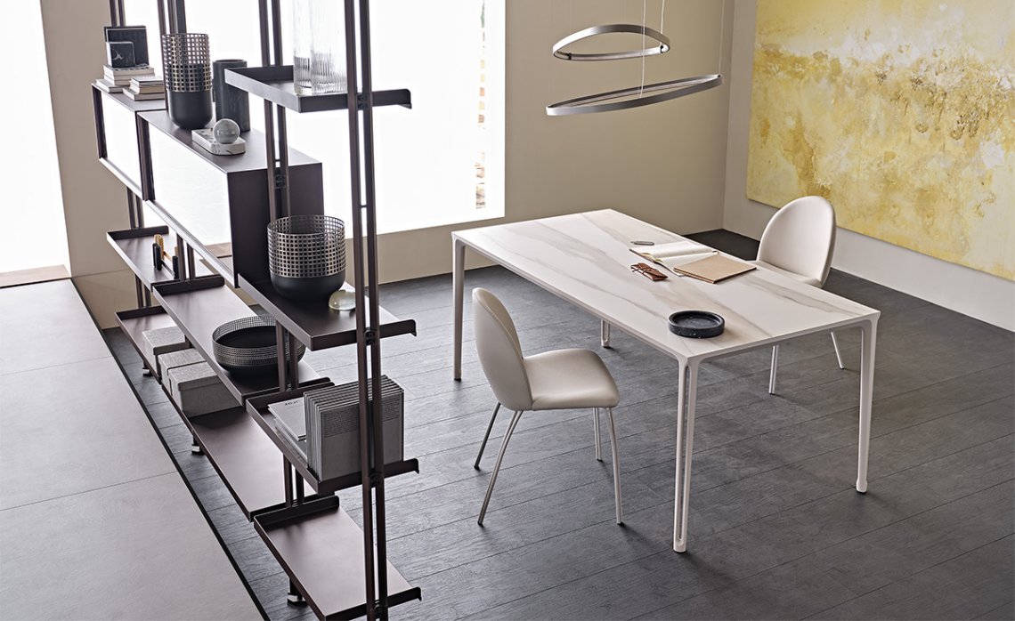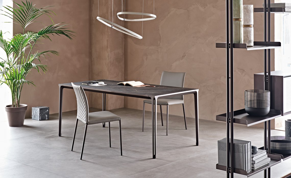 Boulevard is a design dining table with a disarming simplicity. It fits into a residential setting with ease and contemporary charm. The legs have a vertical cavity, enhanced by sophisticated varnished finishes chosen from among different intense or bright shades. The same finish rigorously frames the top, available in glass or ceramic.